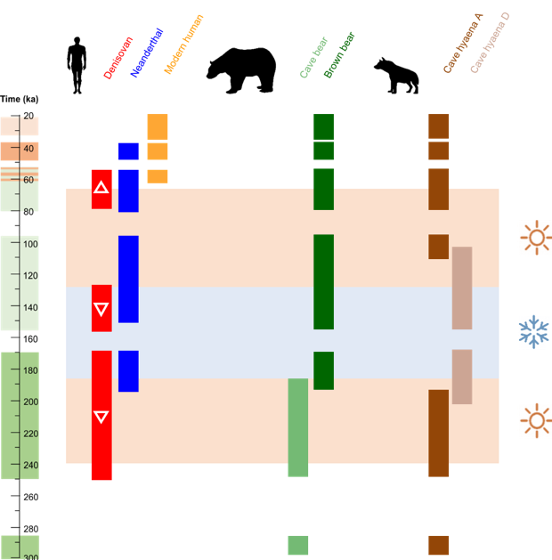 Figure 5: The occupational periods of Denisovans (red), Neanderthals (blue), modern humans (yellow), bears (green) and hyaenas (brown) in the Main and East chambers of Denisova Cave. White triangles (up and down) represent the presence of two different Denisovan mtDNA groups. The timeline represents thousands of years ago (ka) and is colored based on the types of artefacts associated with different periods: early Middle Palaeolithic (dark green), middle Middle Palaeolithic (light green), Initial Upper Palaeolithic (dark orange), and Upper Palaeolithic (light orange). White areas on the timeline represent gaps in the stratigraphy. Warm and cold periods are shown by horizontal bars. (illustration credit: Richard G. Roberts and Zenobia Jacobs).