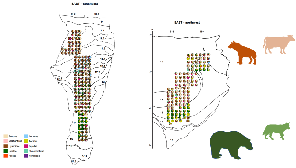 Figure 4: Pie charts of the proportion of DNA fragments assigned to different large mammals for each sample from the southeast and northwest profiles in Denisova Cave’s East Chamber. This shows a turnover from predominantly bear and canid DNA (greens) in the lower layers to hyaenas and bovids (browns) in the upper layers. (Illustration credit: Zenobia Jacobs and Elena Zavala)
