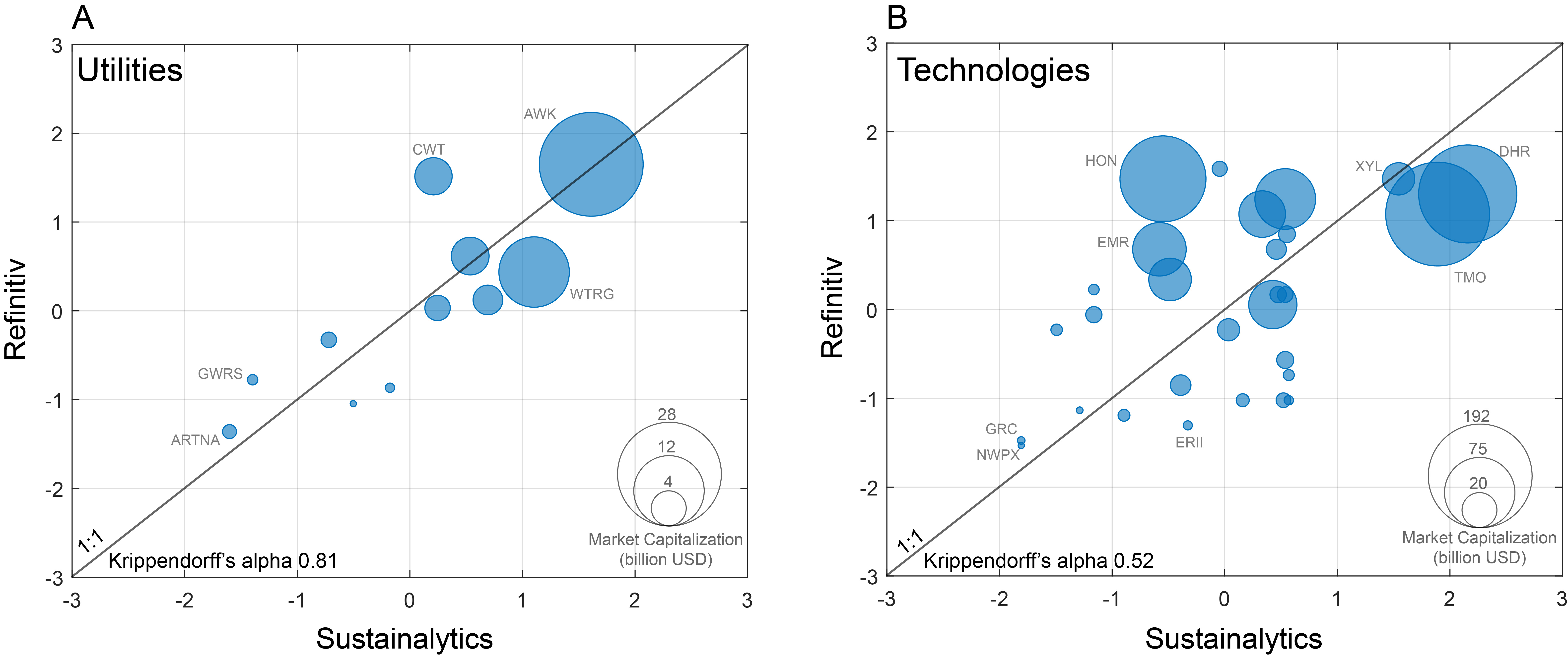 Figure 1 — The divergence in ESG ratings of two ratings agencies, Refinitiv and Sustainalytics, for publicly traded companies in the Utilities and Technologies subsectors in the US water sector. Sustainalytics’ scores were multiplied by -1 and added 100 to allow for comparison. That is, higher values correspond to better ESG performance. I then normalized the scores to have zero mean and unit variance. Ratings were retrieved between Nov 1 and Dec 2, 2022. Krippendorff’s alpha is a measure of inter-rater reliability. Krippendorff suggests α ≥ 0.80 as a customary threshold that the raters’ assessments are reliable; whereas α ≥ 0.667 is the lowest limit where tentative conclusions may be made. Following the taxonomy of Global Water Intelligence, the Utilities subsector includes companies that provide bulk or retail water supply and wastewater treatment services for cities. Technology subsector includes companies that manufacture and assemble water and wastewater treatment systems, including companies that provide components for these systems. symbols of some stocks are shown. (Author’s analysis)