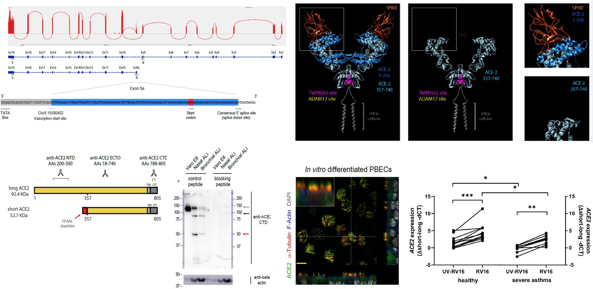 In our paper, which was published with two other manuscripts in Nature Genetics, we detail our discovery, then characterize the expression of short ACE2. We show that short ACE2 is expressed in human nasal and bronchial respiratory epithelia, the main site of SARS-CoV-2 infection. Interestingly, short ACE2 does not contain the sequences that bind SARS-CoV-2 spike protein, which are required for viral entry. In airway cells, short ACE2 is up-regulated in response to IFN and to infection with rhinovirus, but not in response to SARS-CoV-2 infection. While the function of short ACE2 is still unknown, there is a possibility that short ACE2 expression plays a role during SARS-CoV-2 and other respiratory virus infections