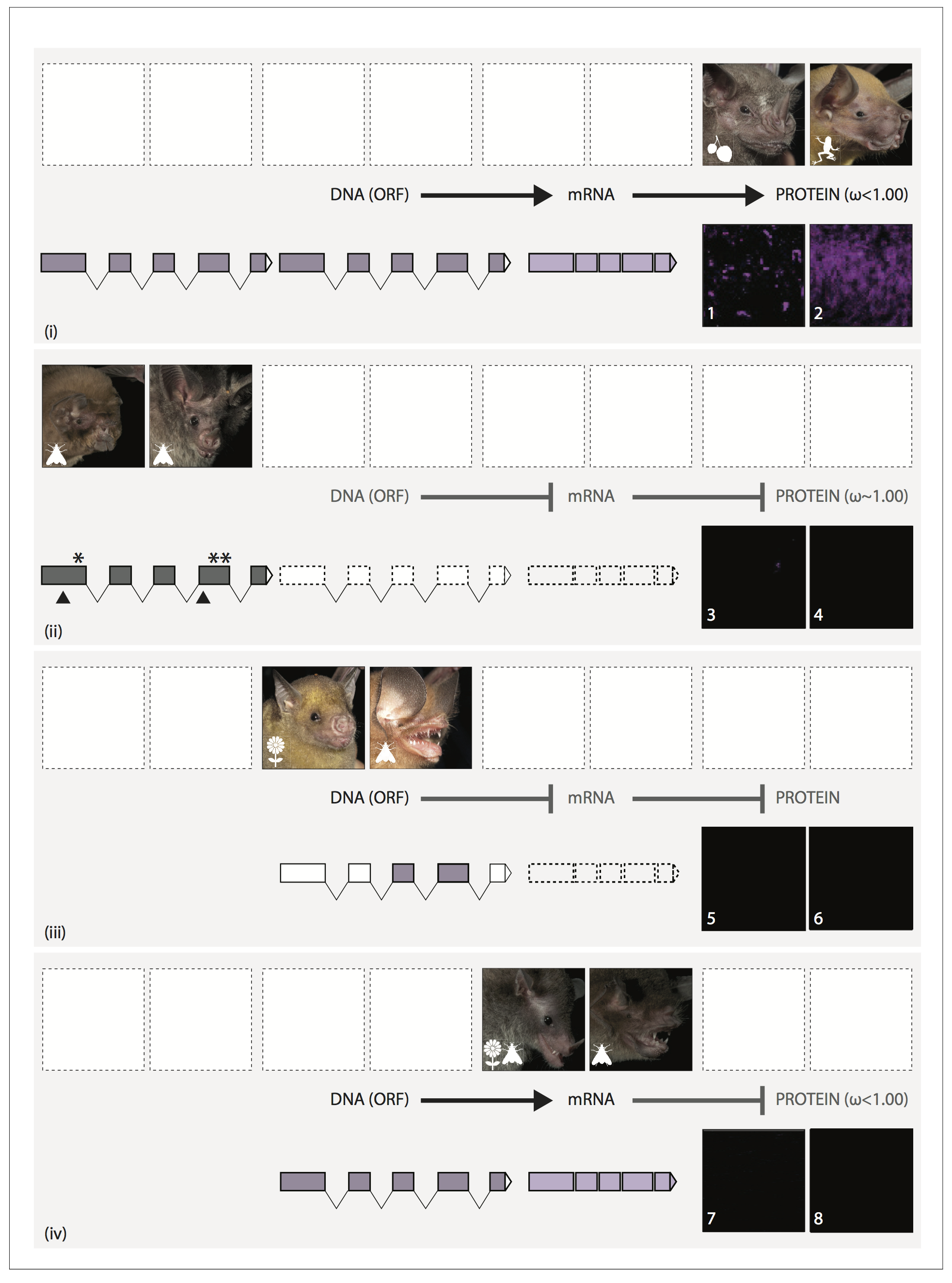 Proposed routes explaining variation in S-cone presence in noctilionoid bats. In each panel, upper images show representative bat species, and numbered images show magnifications of their retinas stained for the SWS1 opsin. (i): Information in the intact DNA Open Reading Frame (dark purple) is transcribed to form mRNA (light purple), which is then translated into OPN1SW.