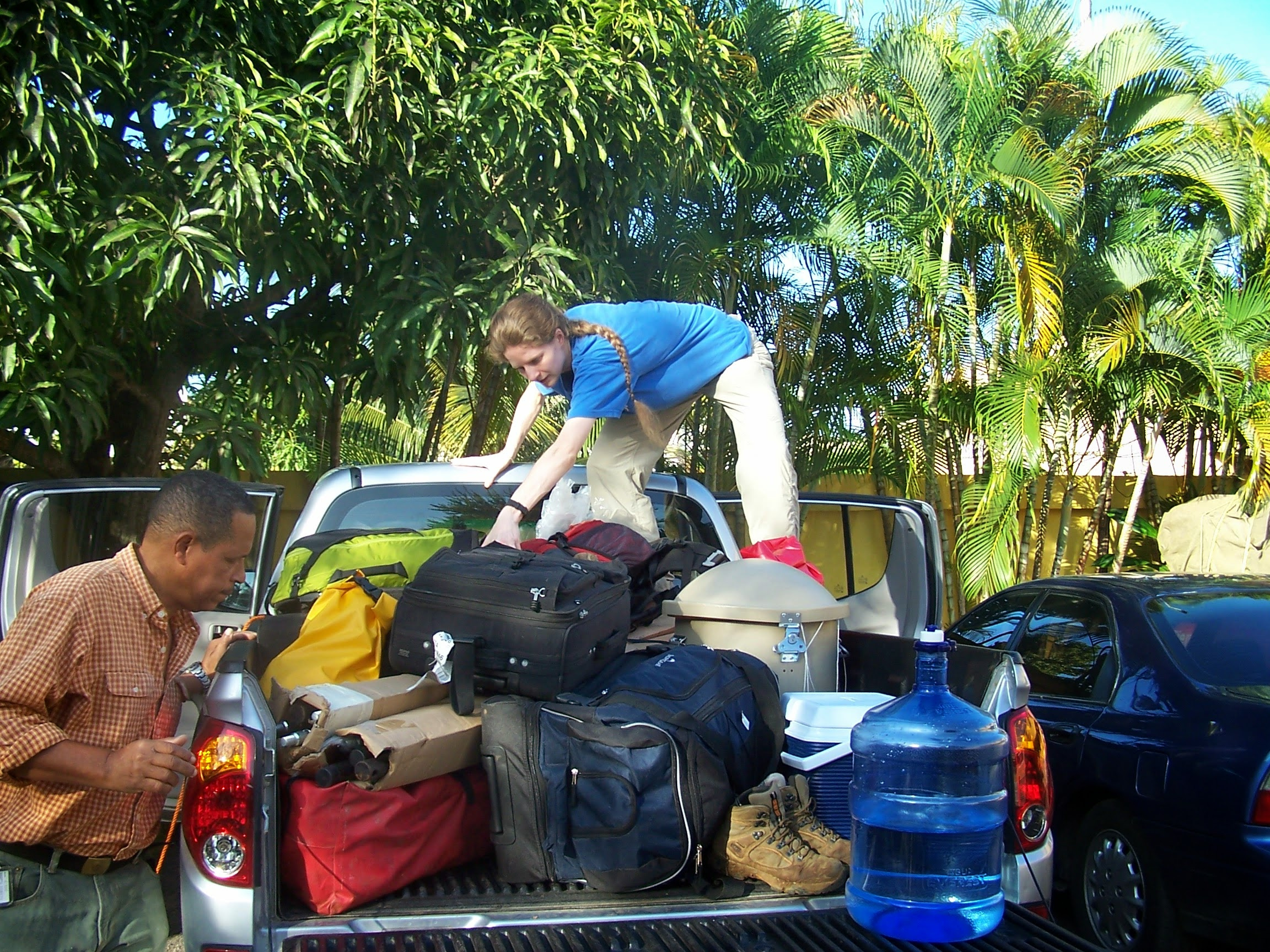 Recovering mRNA requires taking a vapor-phase liquid nitrogen dry shipper, such as shown here with Dominican biologist Jesus Almonthe and graduate assistant Elise Lauterbur.