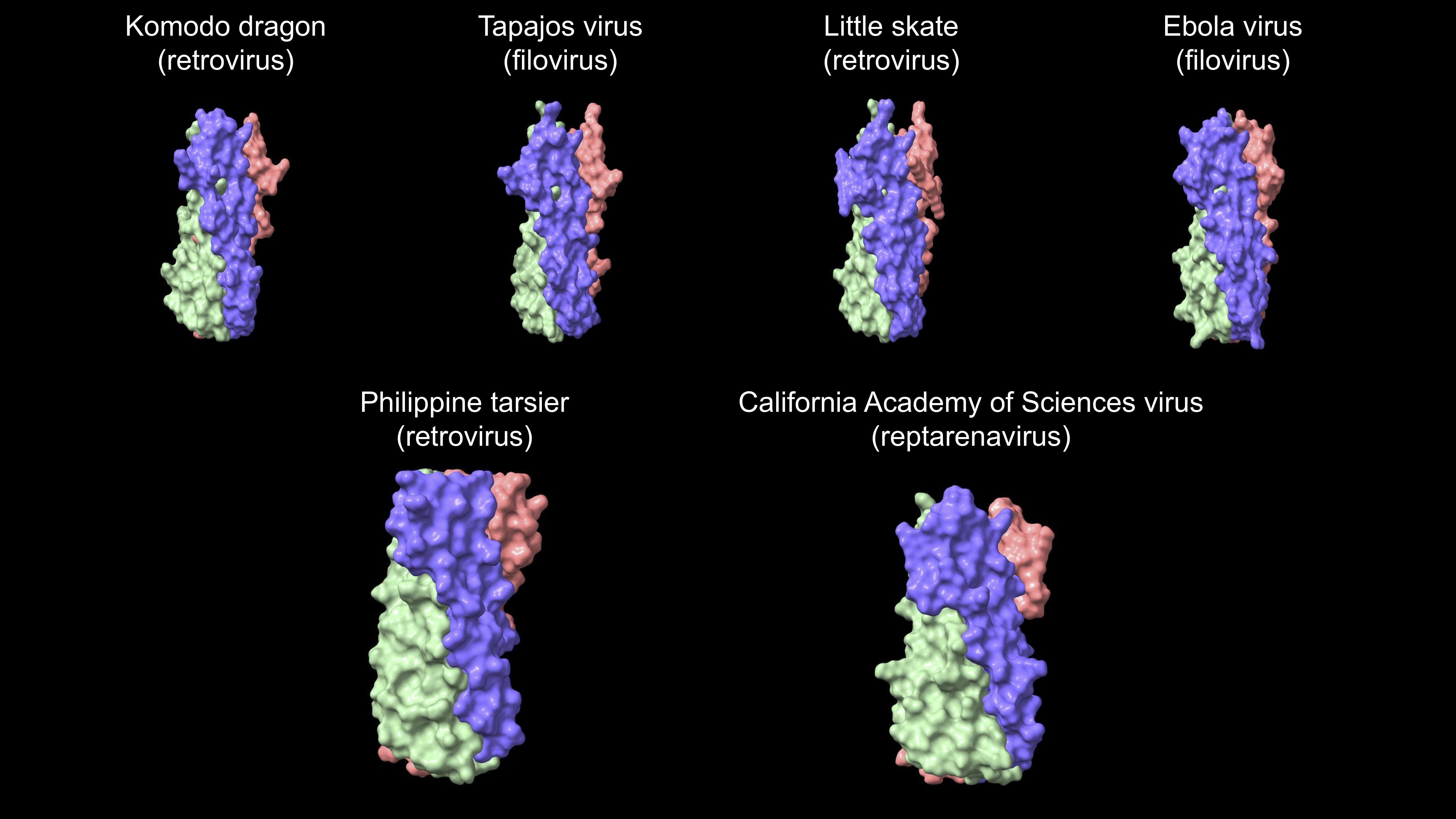 Structural models of the ectodomain trimers of filoviruses, reptarenaviruses, and retroviruses found in vertebrate genomes (Models were inferred using Alphafold.)
