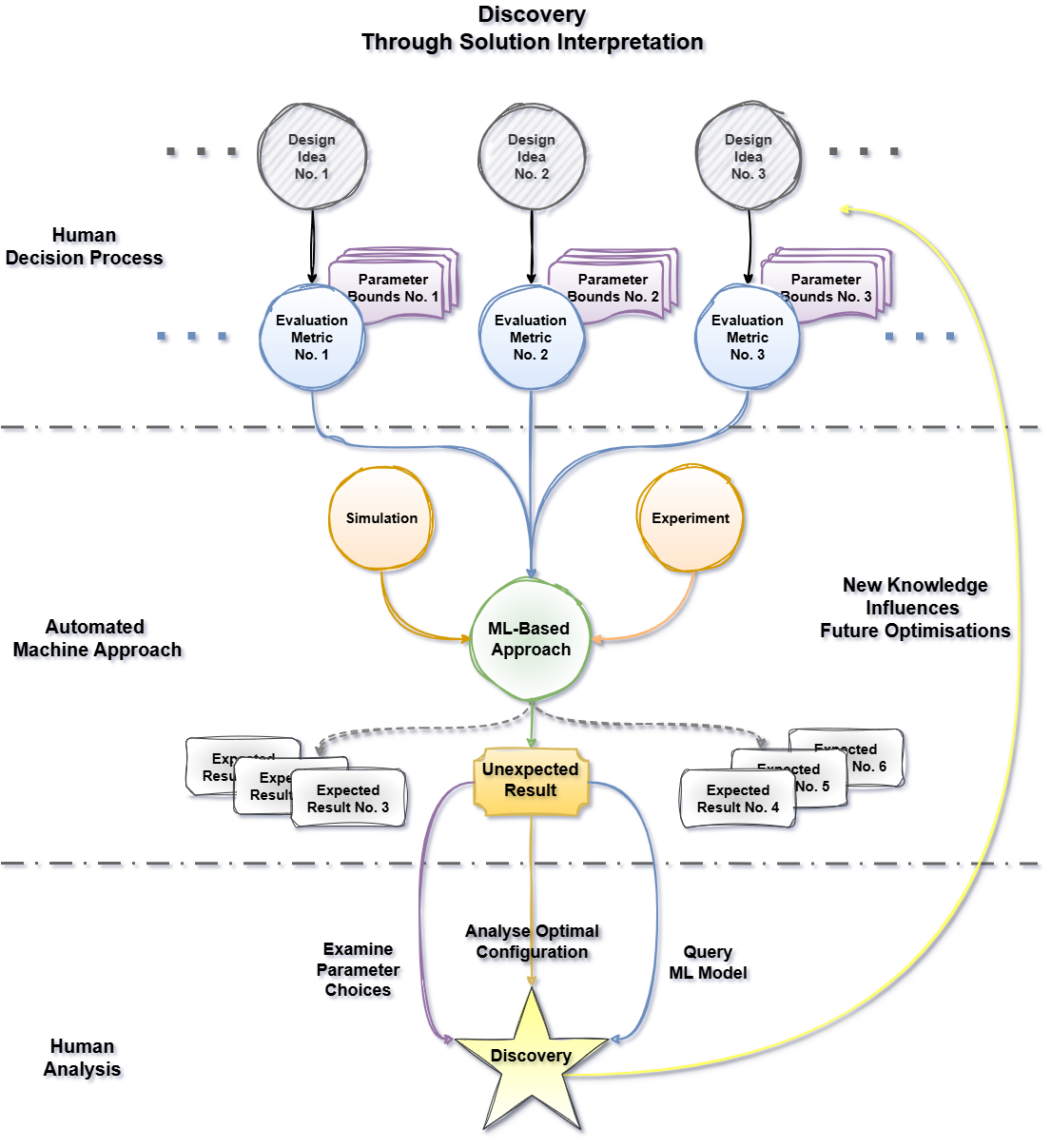 We have shown that machine learning is not only a powerful general tool for design of any device based on physical principles, but it can be used to discover new science. A traditional design cycle includes developing many prototypes that are optimised on each cycle to eventually realise the design objectives. When the design objectives depend on many coupled parameters, numerous iterations are required, which can reach hundreds of thousands to millions of iterations that take a very, very long time. We show that machine learning shortens finds an optimum design in just a few dozen or so iterations. Moreover, machine learning, combined with a numerical computer model of the physics of plasma in the electromagnetic fields of laser beams, is shown to be a powerful tool for design and discovering new science.