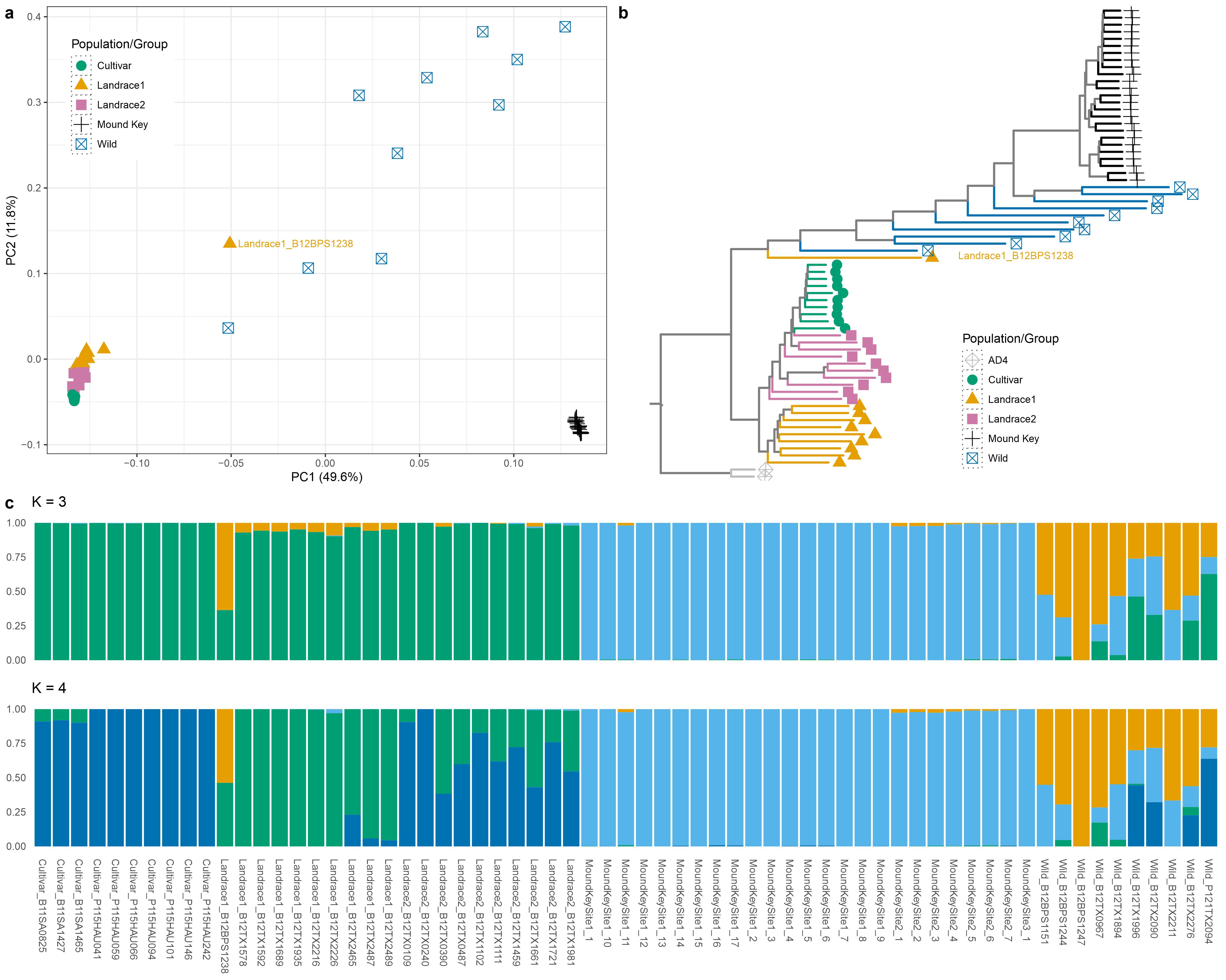 Fig. 3 Population genetic structure analysis of Mound Key and four a priori designated groups of Gossypium hirsutum, including cultivars, landrace 1 & 2, and wild cottons, using genomic SNPs. Each group is represented by a different color and shape in a) PCA and b) rooted neighbor-joining phylogenetic tree (with two G. mustelinum as outgroup). c) LEA genetic structure for three or four ancestral populations (K = 3 and K = 4). Each bar is labeled by an individual sample name (i.e., Accession/Group_SampleID) and filled with different lengths of colors corresponding to proportions of ancestral population signals.