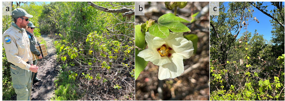 Fig. 2. Collection of Mound Key cotton. a) Sampling with assistance from Park Manager Zachary Lozano, Park Biologists Justin Lamb and Karen Rogers, and biologist Jennifer McGann. b) The flower morphology of the Mound Key cotton population. c) The Multi-branching shrub of Mound Key cotton.
