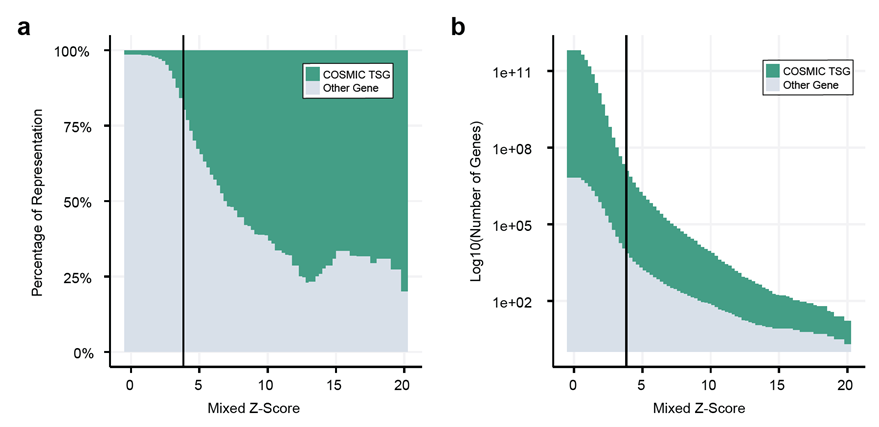 Figure 1 COSMIC defined tumor suppressor genes by mixed Z-Score cutoffs – a) Percent of observations and b) Log10 Number of genes that come from COSMIC defined Tumor suppressor genes, with the Mixed Z-Score cutoff on the x-axis. Plots represent cumulative observations. Figure comes from Supplementary Figure 2a and 2b of manuscript.