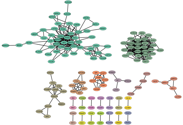 Our co-occurrence network provided many initial positive controls, including gene groups such as members from the JAK-STAT signaling co-occuring together, TP53 pathway members, STAGA chromatin remodeling complex, and hippo pathway members to name a few examples. However, like previous co-essentiality networks, we sought to identify from this network new functional annotations, specifically functional annotations of gene pathways that we do not normally consider to act as PSGs.