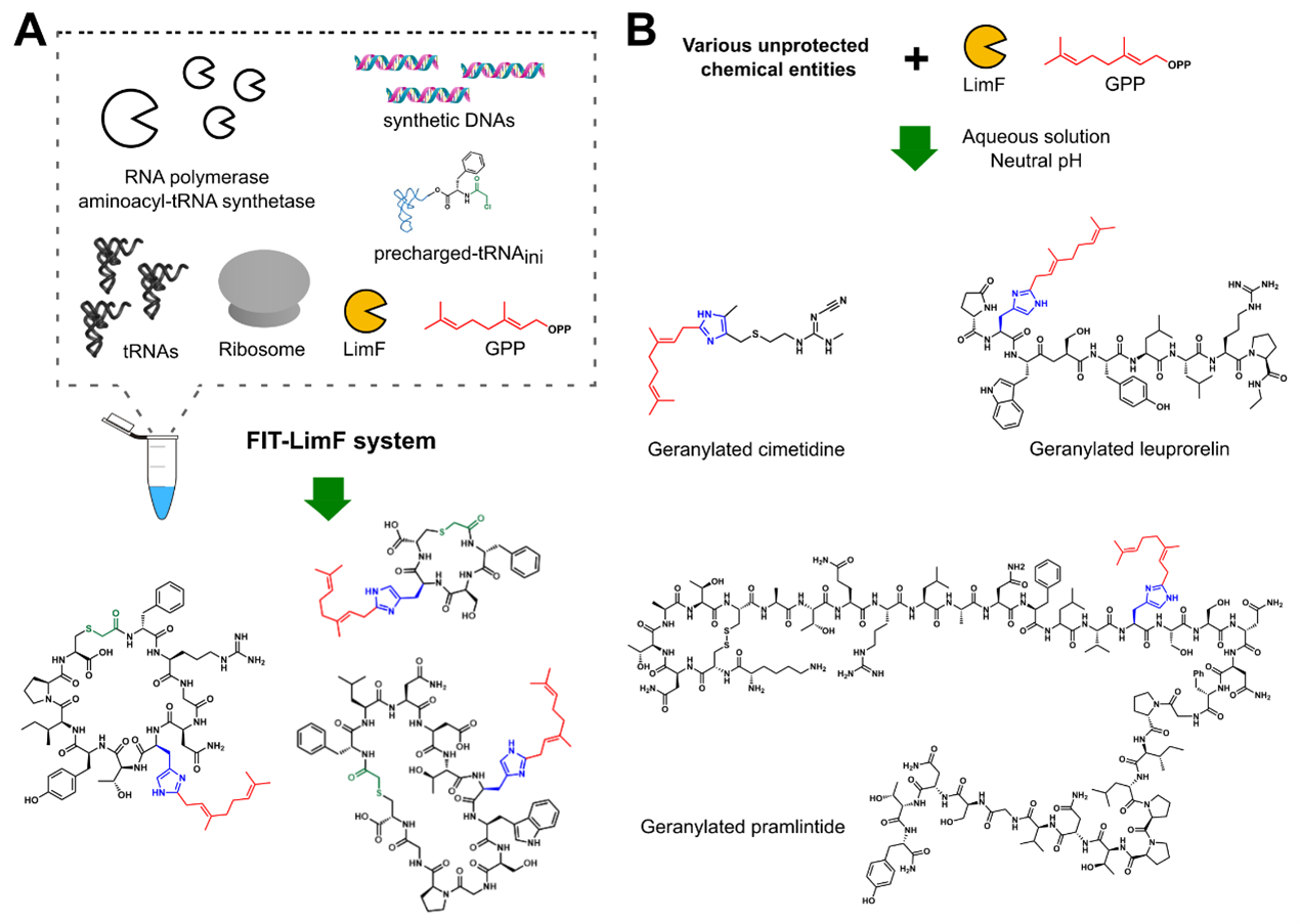 Figure 2: (A)The schematic illustration of the FIT-LimF system for in-depth substrate profiling. (B) LimF acts as a biocatalyst for regioselective His-geranylation on unprotected drug compounds.