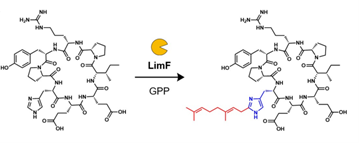LimF is involved in the lim pathway from Limnothrix sp. CACIAM 69d. Although it was previously annotated as a homolog with Tyr-O-PTase PirF4, the sequence similarity network analysis hinted LimF would have unique catalytic activity. In our paper published on Nature Catalysis, we have characterized LimF as a unique His-C-PTase. To further study LimF, we first synthesized the backbone-cyclized (bc) putative substrates bcLimE1, bcLimE2, and bcLimE3 based on the analogy of lim pathway and other cyanobactin biosynthetic pathways. Upon the incubation with recombinant LimF and various prenyl donors, we found that the His residue of bcLimE2 was geranylated in the presence of geranyl pyrophosphate (GPP) (Figure 1). Meanwhile, neither bcLimE1 nor bcLimE3 was modified with any prenyl donors. We further validated the geranylation to be forward direction (i.e. prenylation at the primary carbocation) on the imidazole-C2 position of His sidechain by NMR analysis of LimF-modified bcLimE2. We were surprised by such observations since His modifications are rare in nature; especially the chemistry occurs at the most electron-deficient imidazole-C2 position. To further evaluate the catalytical potential of LimF, we assayed it with a series of synthetic substrates including dipeptide Ac-Ala-His-NH2, Fmoc-His-OH, and freestanding His; LimF retained its fidelity of His-modification on diverse substrates.