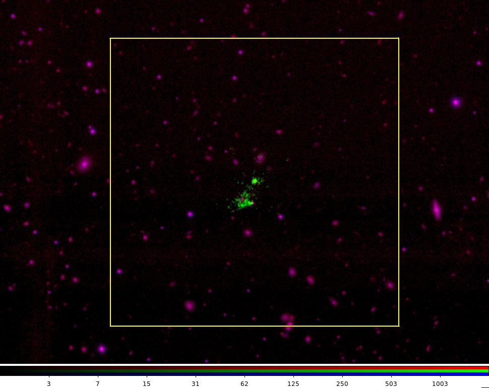 Three-color image of the sky around Lyman-alpha blob 6 (LAB-6). In green is the Lyman-alpha emission from LAB-6. LAB-6 is 18.5 billion light years away from us in the direction of constellation Grus, with an extension about half million light years. The physical size of the yellow box is 3.26 million light years. Most galaxies seen in this image are foreground galaxies. (Blue: VLT/Hawk-I J band at 1.258 micron; Red: VLT/Hawk-I Ks band at 2.146 micron; Green: Lyman-alpha emission at 0.411 micron with Blanco 4m telescope at the Cerro Tololo Inter-American Observatory). Credit: Yiping Ao/VLT/Blanco