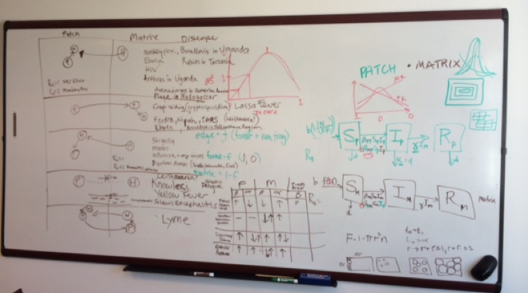 I was not alone in studying these ideas– Raina Plowright has shown that land use practices change movement and immunity of fruit bats carrying zoonotic viruses, Tom Gillespie had been looking at the impacts of deforestation on pathogen sharing between humans and primates in Africa, and Nicole Gottdenker has set up a long-term study system of Chagas disease across a gradient of land use in Panama. These empirical experts (who also are very fluent in theoretical work), along with interdisciplinary assortment of economists, anthropologists and ecologists came together in 2012 as a part of a working group.
