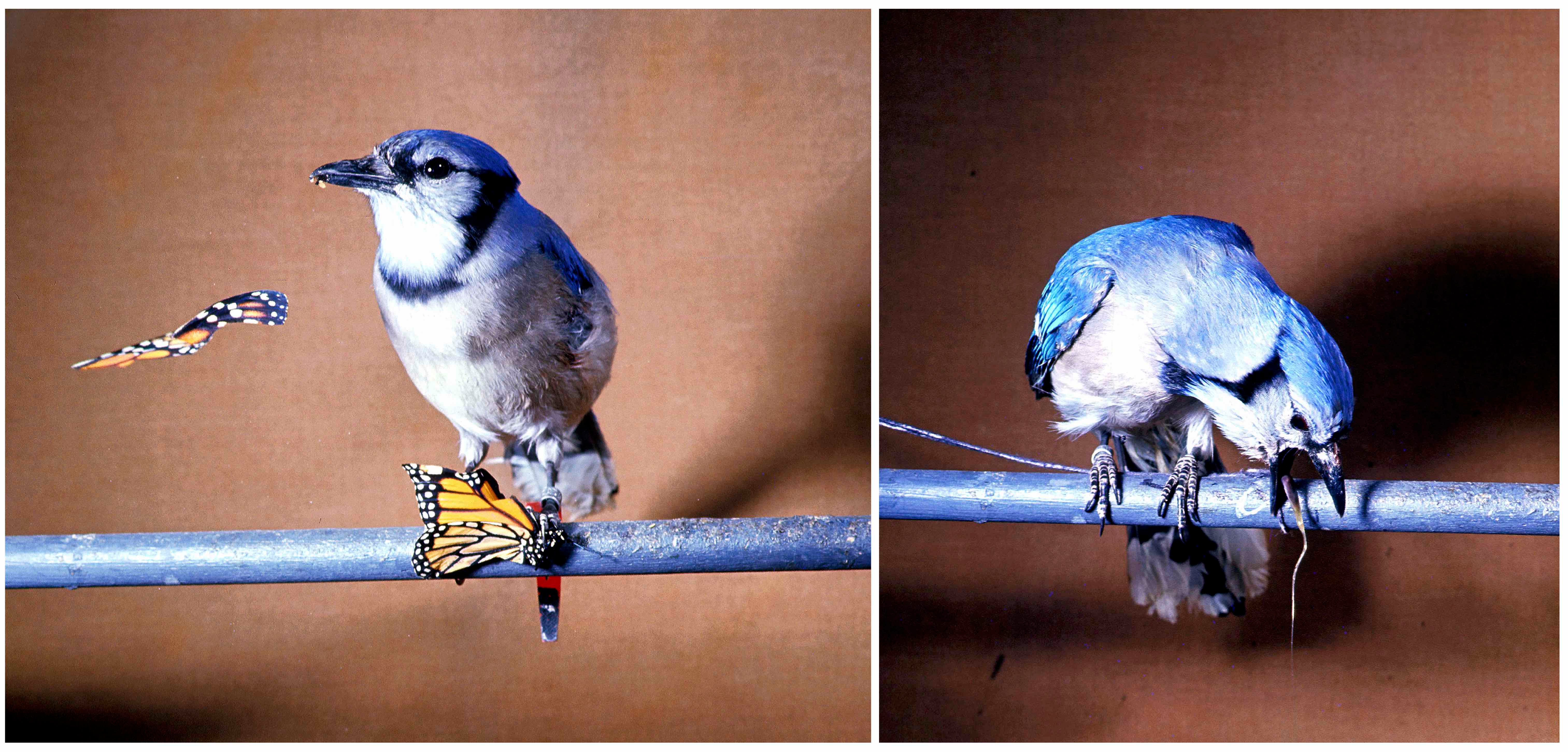 A naive blue jay pecks at a monarch butterfly that contains toxins stored from eating milkweed plants as a caterpillar. (Photo credit: Lincoln Brower)