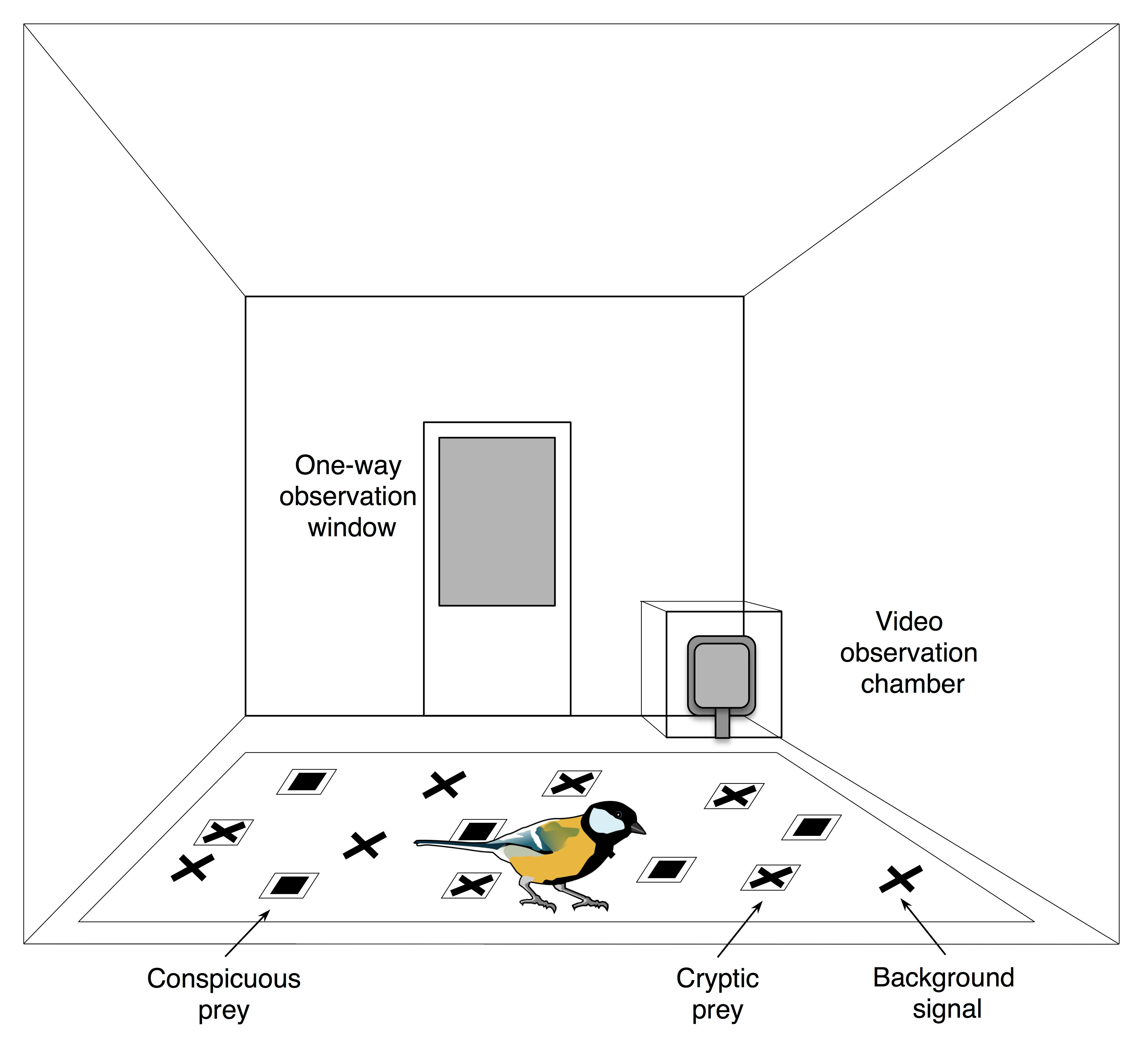 The ‘Novel World’ room – wild great tits forage for paper packages containing almonds, half of which are unpalatable and marked with a conspicuous square symbol (the novel warning signal). The others are palatable but 4 x harder to find (they share the cross symbol with the background). Half of the birds were first presented with a video to show that squares were disgusting (‘socially-informed’ predators) while others only saw a video of the prey (‘naïve’ control predators). Clipart of great tit in public domain (Pesasa / Openclipart.org).