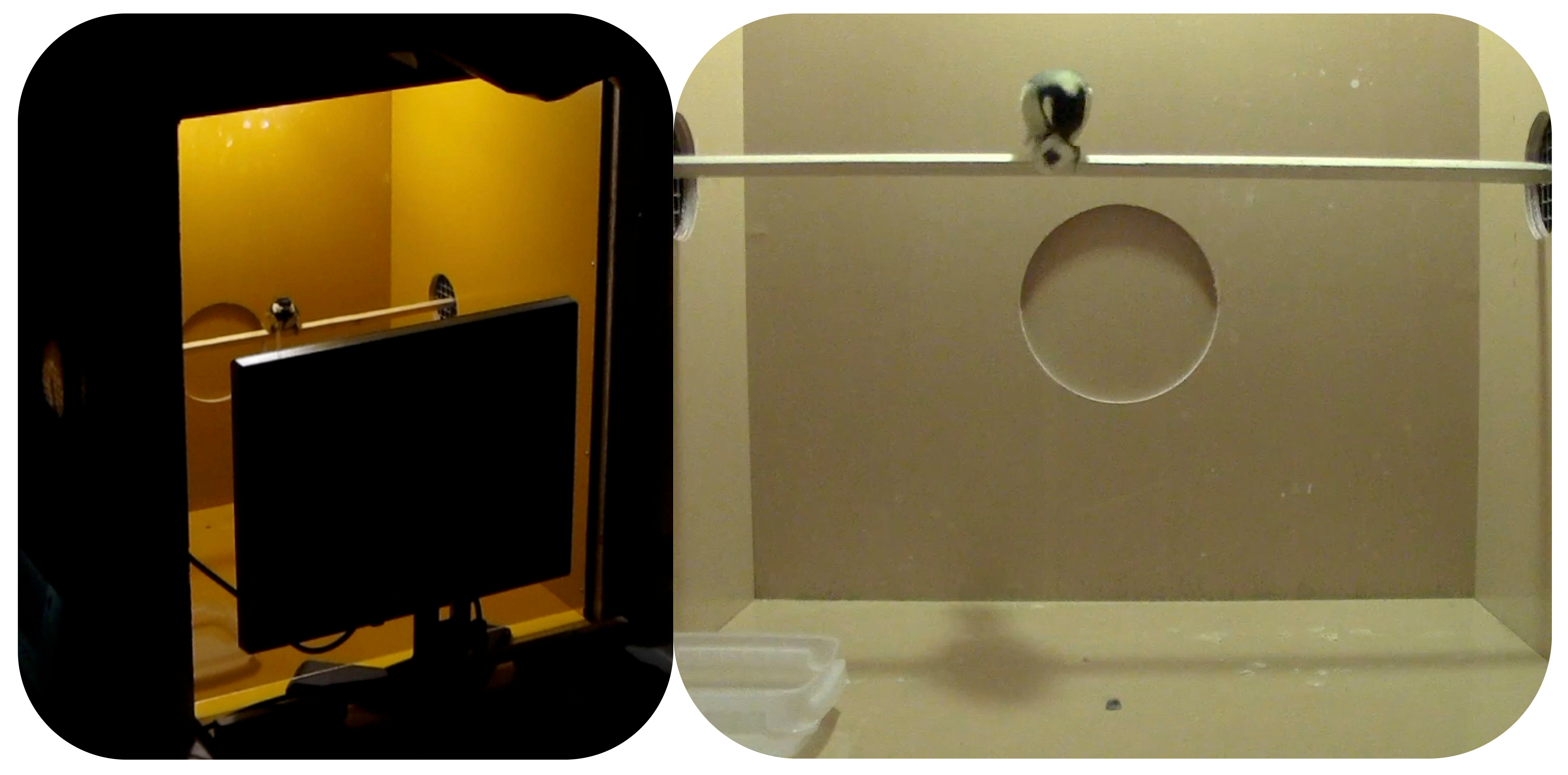 A great tit gathers social information about the novel ‘square’ warning signal in our experiment by watching a video of a ‘disgust’ response. (Photo credits: Rose Thorogood)