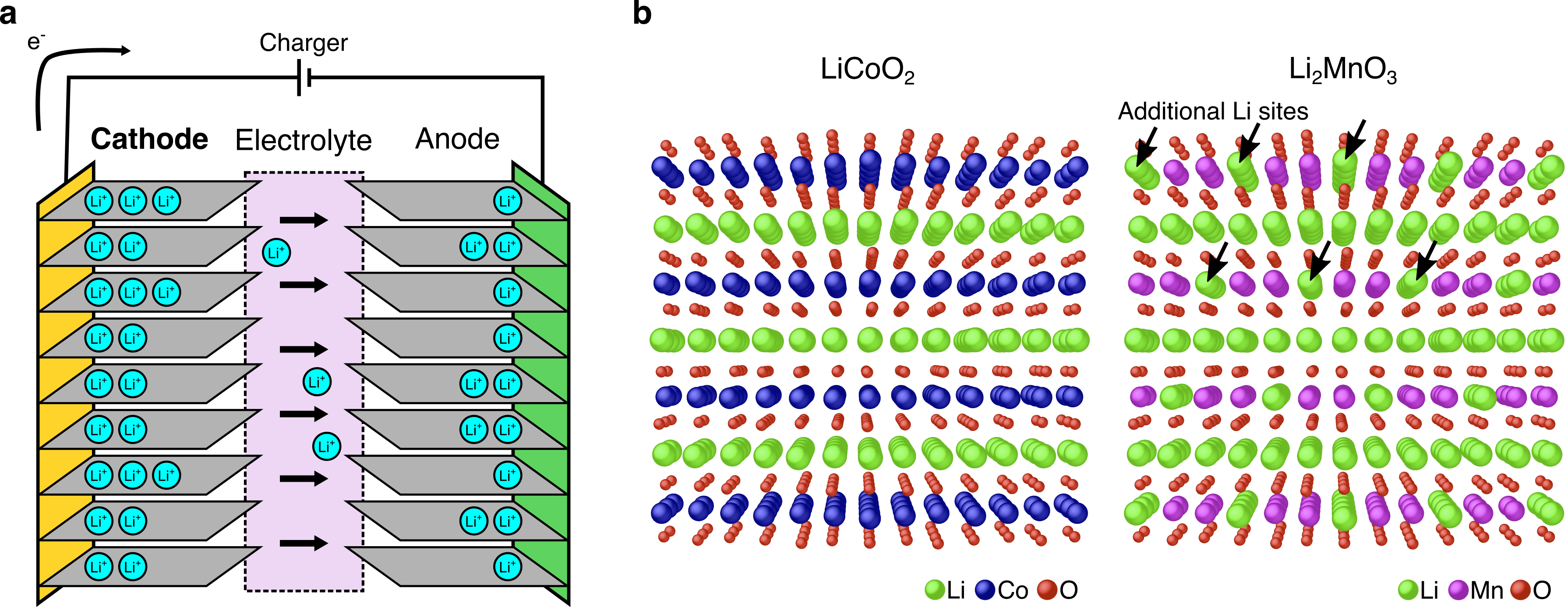 Fig. 1 a Schematic view of the lithium-ion secondary battery in a charge process. b Crystal structures of current standard Li2CoO2 (left) and lithium-excess Li2MnO3 (right). Li2MnO3 is characterized by the additional lithium sites in the transition metal layers, as indicated by the arrows. These excess lithium-ions contribute to the higher energy capacities.
