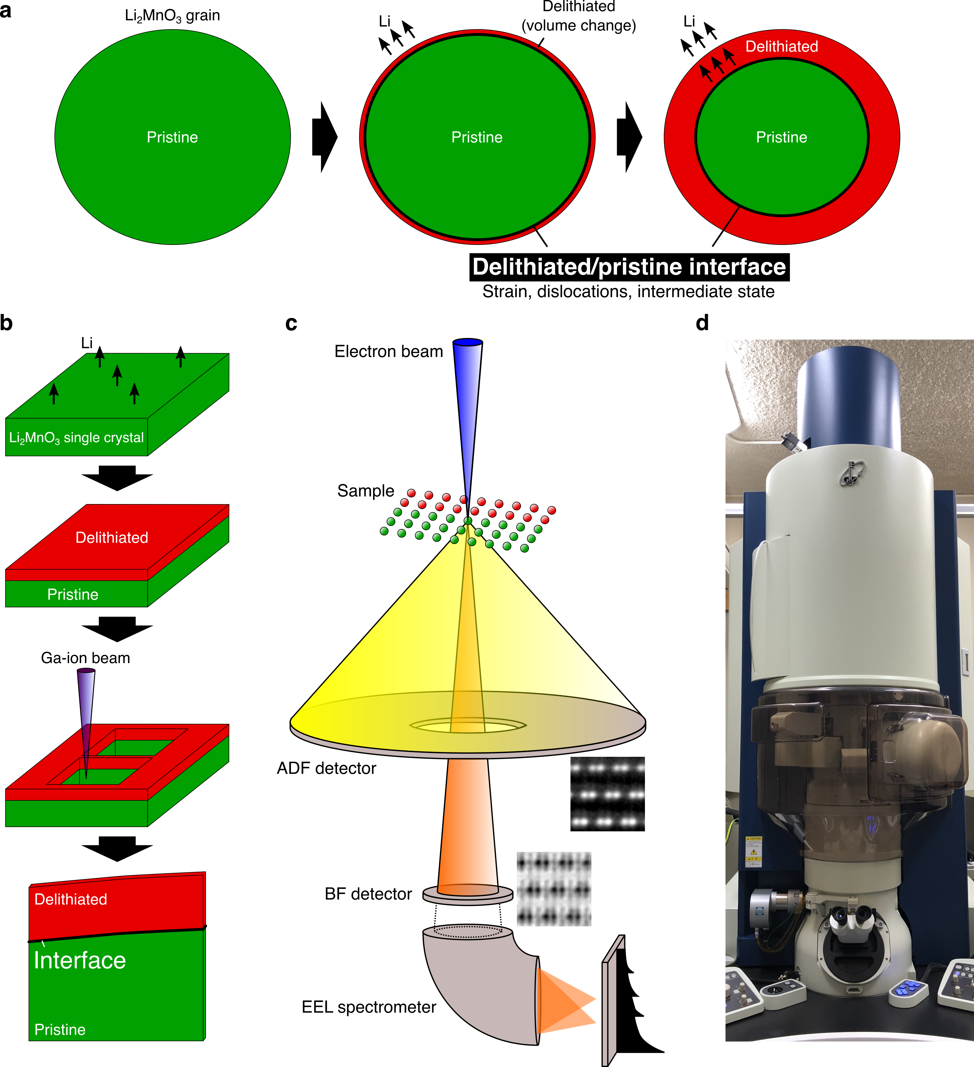 Fig. 2 a Schematic view of the delithiation process of a Li2MnO3 grain. The delithiation proceeds along with the motion of the interface between the delithiated and pristine regions. b Schematic view of the sample preparation for atomic-resolution STEM imaging and spectroscopy. A single Li2MnO3 crystal was partially delithiated from the surface, and electron-transparent thin samples for STEM were made by a focused ion beam (FIB) technique. c Schematic view of STEM. By scanning a focused electron probe (less than 0.1 nm) over a thin sample and detecting the transmitted or diffracted electrons, atomically resolved structural images are obtained. There are mainly two imaging modes, namely, the annular bright-field (ABF) and annular dark-field (ADF). With the aid of the electron energy-loss spectroscopy (EELS), we can also analyze chemical compositions and electronic structures. d Photo of our microscope (ARM200CF, JEOL Ltd.).