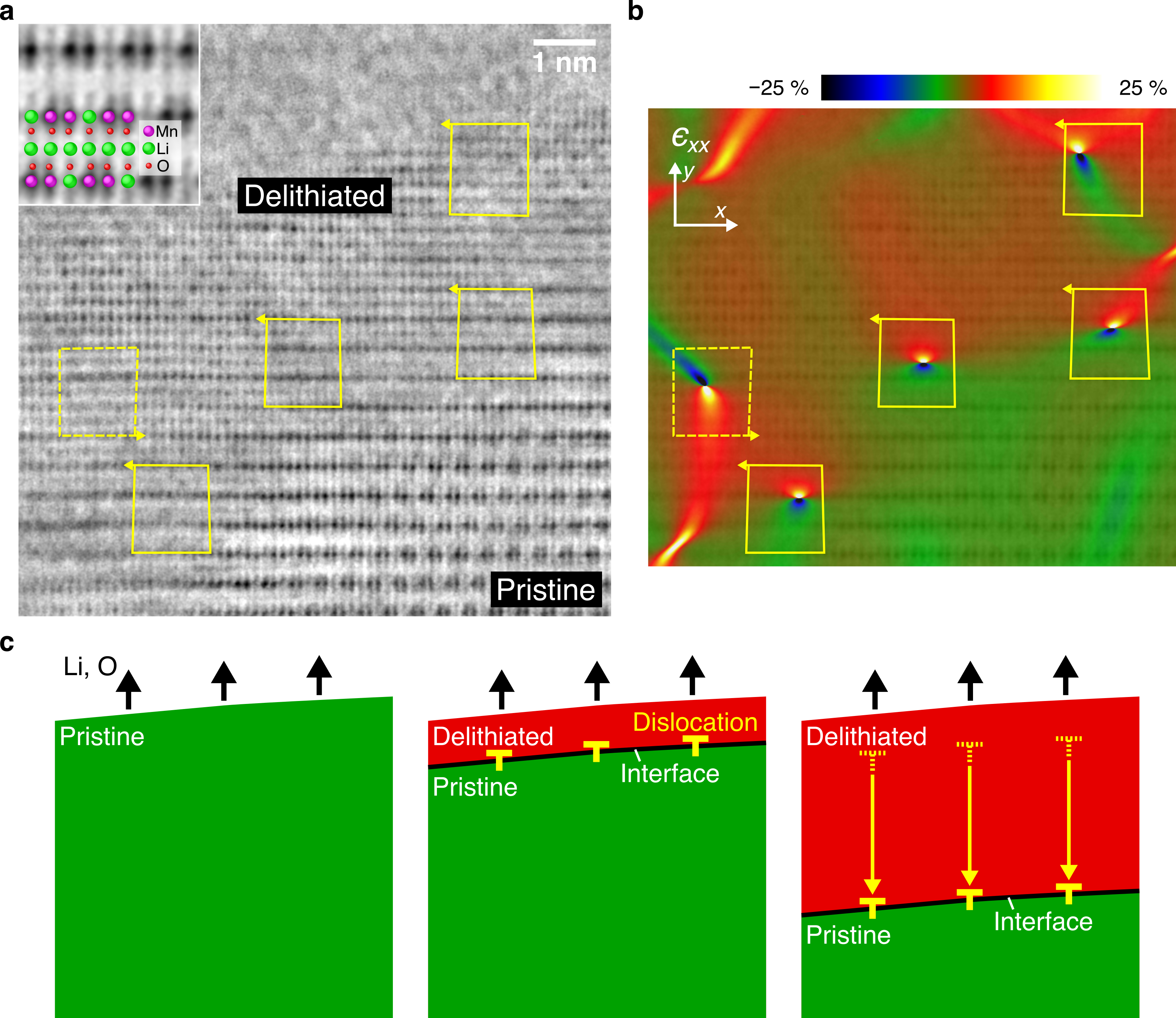 With the aid of EELS analysis, we found that oxygen in Li2MnO3 is partially released during the delithiation process, because the tetravalent Mn is hard to be further oxidized. On the close inspection of atomic structural analysis in the delithiated region, we found that Mn atoms are partially substituted for the Li sites, leading to the formation of Mn/Li disordered structure. At the interface between the delithiated and pristine regions, we found the cation disordered new structure. In addition, dislocations (one-dimensional lattice defects) were also found at the interface (Fig. 3a, b). Such dislocations are introduced to compensate the lattice mismatch between the expanded delithiated region and the pristine region, where the lattice expansion is induced by oxygen-release.