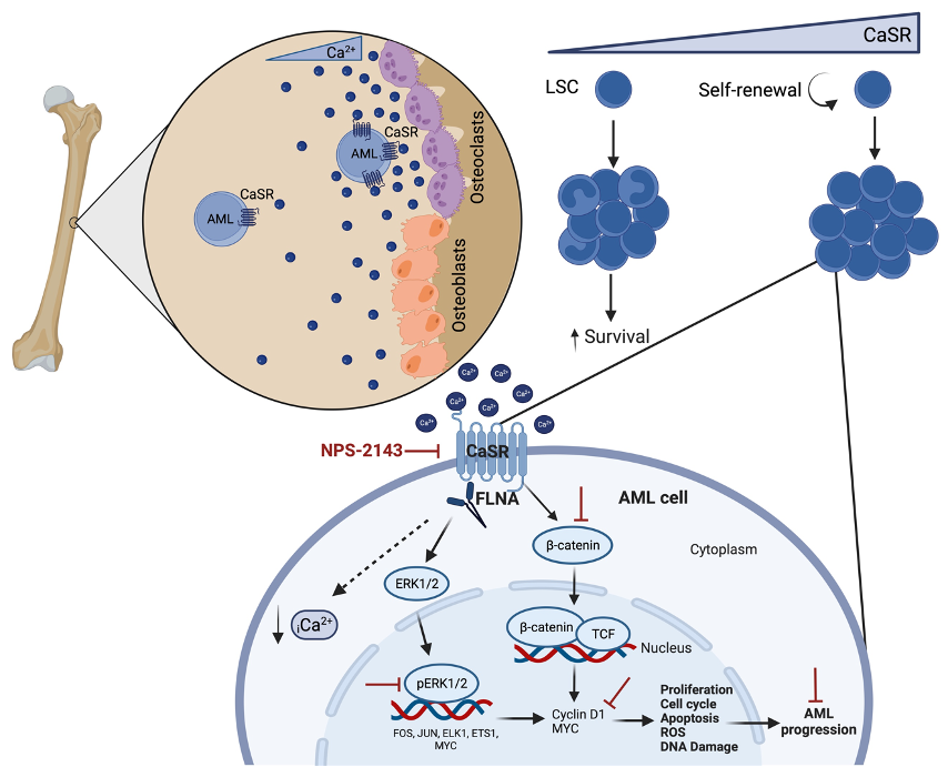 Focusing on MLL‑AF9-driven AML, CaSR was shown to regulate proliferation, cell cycle, apoptosis, generation of reactive oxygen species (ROS), differentiation, and DNA damage. Molecularly, CaSR interacts with filamin A, a crosslinker of actin filaments, and modulates MAPK-ERK and Wnt β-catenin signalling and intracellular levels of calcium in AML cells. Overexpression of CaSR leads to a higher pERK/ERK ratio and higher β-catenin, MYC and cyclin D1 levels, contrasting with our observed downregulation of these proteins when CaSR was depleted.