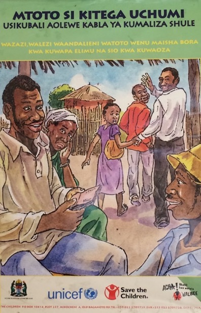 The image, a poster displayed in a village office in rural Mwanza, Tanzania, warns of the dangers of female “child marriage” – defined by the development sector as any marriage before 18 years of age. It is a cartoon drawing of a man happily holding a stack of money as a distressed young girl is led away by an older man. The only other female in the image, a woman and presumably the girl’s mother, also looks visibly distressed. Two other men look on with contentment. Under the image, logos for UNICEF and Save the Children are displayed and Swahili text above the image reads: