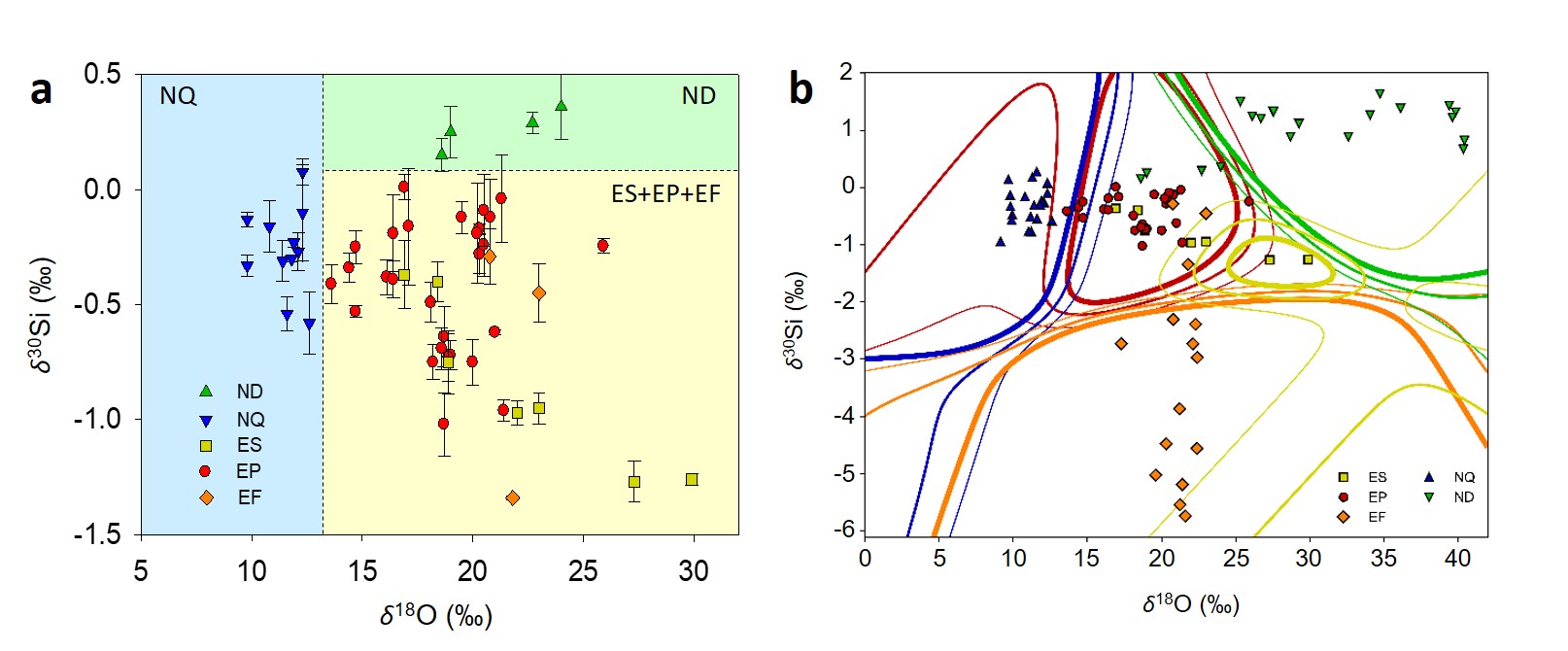 Fig. 2 Si and O isotopic fingerprints of SiO2 NPs of different origins. a, Si-O 2D isotopic fingerprints of SiO2 NPs with source differentiation by two straight lines (δ18O = 13‰ and δ30Si = 0.1‰). b, Si-O 2D isotopic fingerprints of SiO2 NPs with linear discriminant analysis (LDA) into five classes.