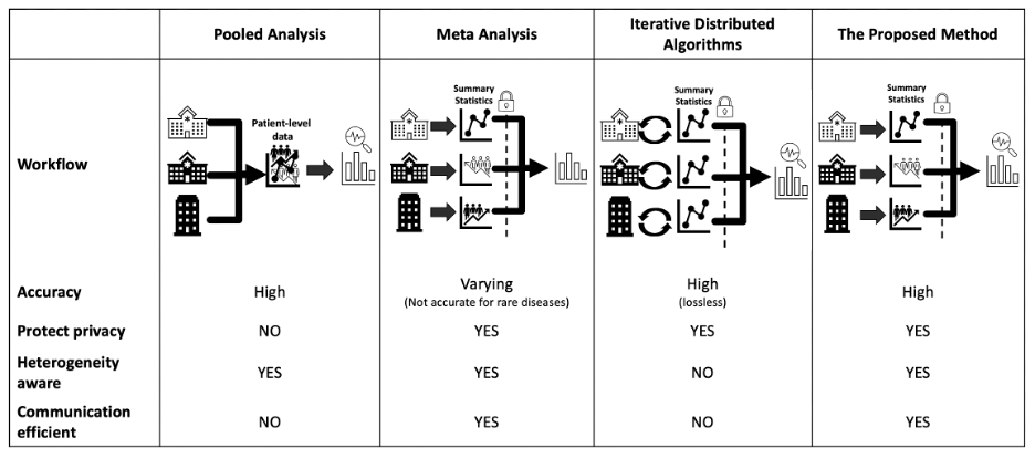 Figure 2 shows the comparisons between the pooled analysis, meta-analysis method, iterative distributed algorithms, and the proposed method from various aspects. The proposed method, which is based on the surrogate pairwise likelihood approach, can retain high accuracy in estimated model parameters, protect patient privacy, handle heterogeneity, while being communication efficient.