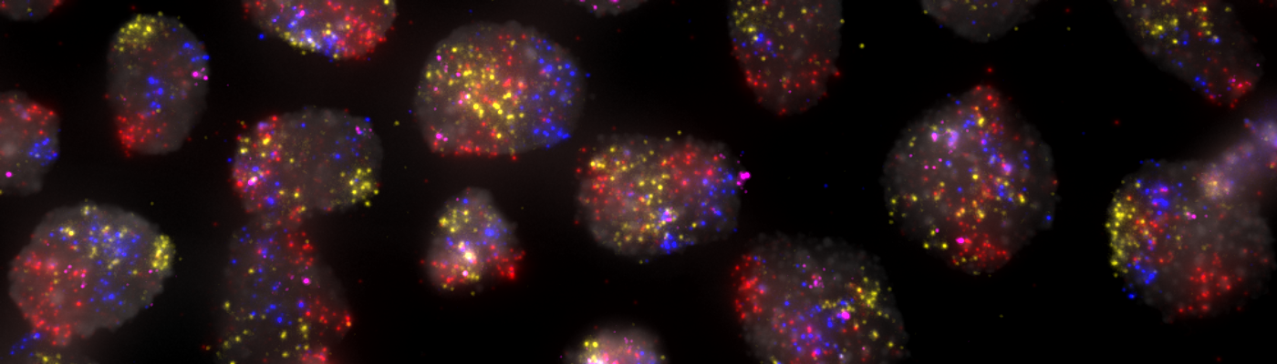 In human cells, more than two meters of DNA are squeezed in an organelle — the nucleus — that has a diameter six orders of magnitude smaller. How can we study this complex packaging problem? One approach is to use DNA Fluorescence in situ Hybridization (a.k.a., FISH), a microscopy technique developed more than two decades ago by which one or more genomic regions, or even entire chromosomes, are visualized directly inside the cell nucleus. The magic behind DNA FISH is that, when fixed cells are heated for a short time in the presence of denaturing agents such as formamide, the DNA helix opens up so that a set of short DNA pieces added to the cells from outside can bind to their exposed complementary sequences in the genome. These DNA fragments, which together constitute so-called FISH probes, are chemically attached to fluorescent dyes, so that the location to which they bind in the nucleus ‘lights up’ when cells are observed with a fluorescence microscope.