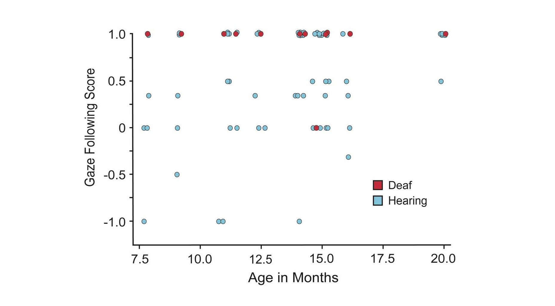 Gaze-following deficits have also been identified as a potential marker for developmental concerns such as Autism (Mundy, 2018). Based on my prior research and personal interactions with deaf infants, I had the feeling they might show this capacity to follow an adult’s gaze earlier than 1 year of age. So, together, we implemented Brooks & Meltzoff’s experimental design for testing gaze-following and compared deaf infants who have deaf parents (which means the infants have been signed to since birth) to age- and gender-matched hearing infants (between 7 - 20 months). We found the deaf infants showed significantly advanced gaze-following behavior compared to their hearing age-mates, suggesting that their early experience (whether it is deafness or sign language experience) has shaped the way they engage with the world – that is, this is an impressive example of how infants will adapt just so that they can connect with others. In these deaf infants, gaze-following emerged well before their first birthday.