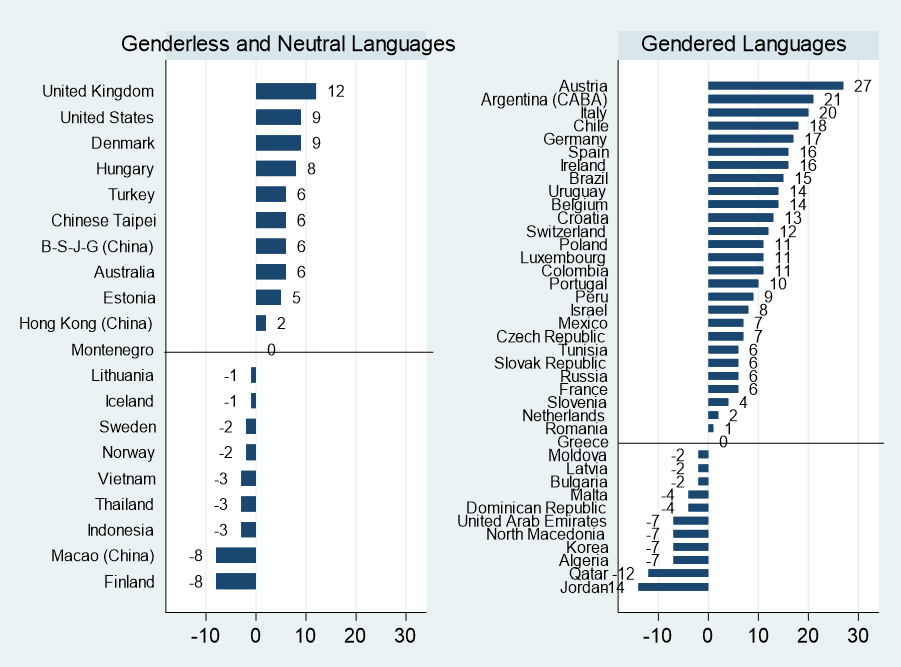 In our research paper, Do gendered languages fail women in math? published by npj Science of Learning, we asked whether gendered languages generated gender gaps in mathematics achievements or are merely correlated with them. We provided evidence for causality, by exploiting the prominent (but not exclusive) practice in gendered languages of using masculine generics to address women. Using a large representative sample of Hebrew-speaking adults in Israel, we showed that addressing women in the masculine, compared to the feminine, negatively affected their performance in math. In fact, when women are addressed in the feminine and men in the masculine, the gender gap in mathematics achievement is reduced by a third, compared to when both women and men are addressed in the masculine (Figure 2).