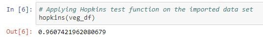 As shown above, the hypothesis test value is 0.96 which is quite close to 1, so we can reject the null hypothesis and this means that the data set is non-uniformly distributed implying the presence of clusters.