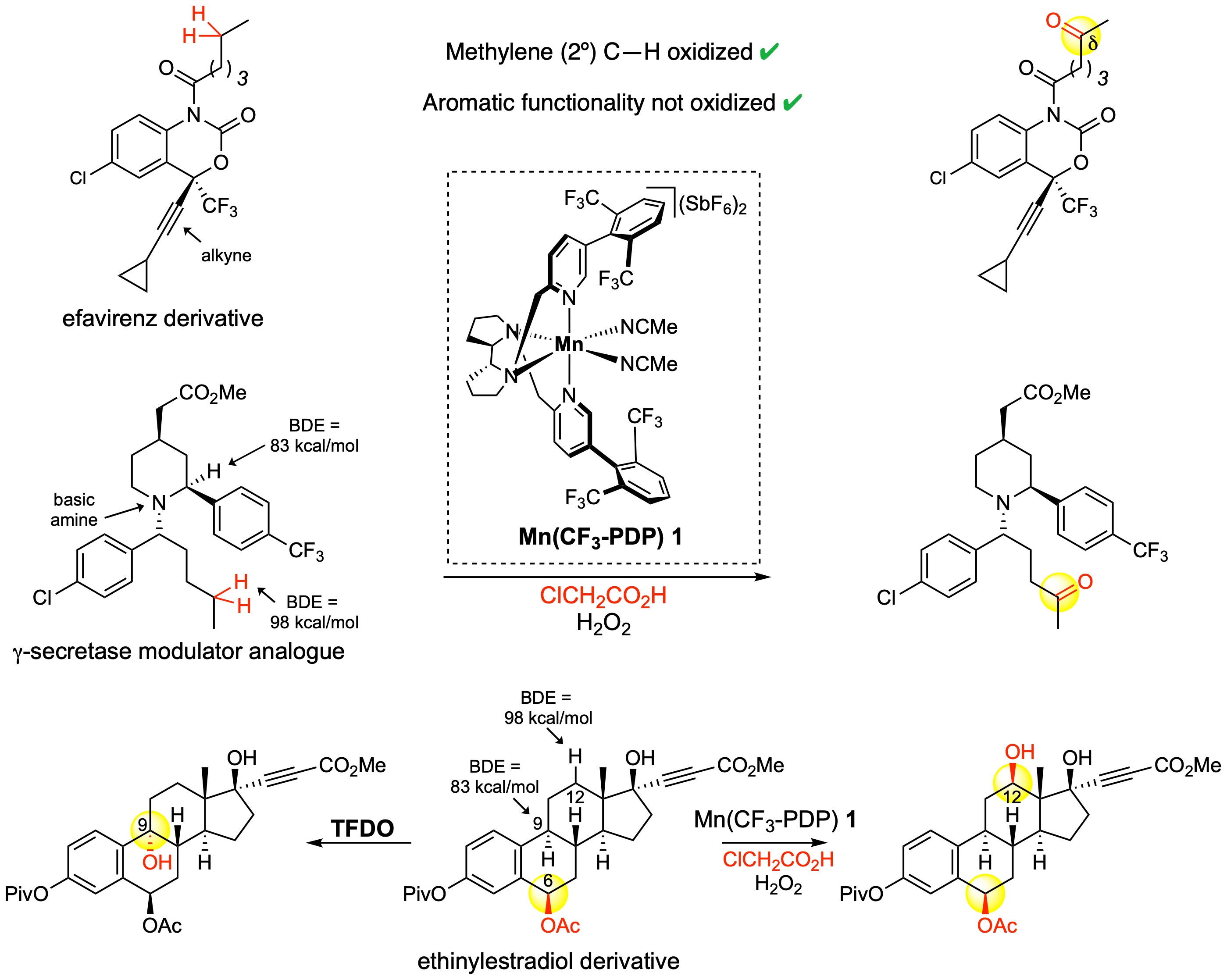 Together with a talented, international team [MCW (Greece/USA), Takeshi Nanjo (Japan), Jinpeng Zhao (China, lead author), Emilio de Lucca Jr. (Brazil)], we demonstrated combination of Mn(CF3-PDP) 1/chloroacetic acid has led to a remarkable system that can preparatively oxidize 50 aromatic compounds at remote methylene cites in the presence of medicinally relevant halogen, oxygen, heterocyclic and biaryl moieties. Chemoselectivity in late stage oxidation is showcased in four drug scaffolds that undergo methylene oxidation in the presence of oxidatively labile alkynes, activated benzylic sites, and basic amines. We demonstrate that all other reported oxidants, including TFDO, are not able to effect remote methylene oxidation in the presence of such aromatics. We additionally demonstrate the ability to effect rapid generation of a drug metabolite (piragliatin) from an advanced intermediate. We anticipate that this method will enable late-stage oxidation to gain even more widespread use in drug discovery and development. Additionally, we hope this discovery inspires future catalyst design to strive to solve selectivity challenges by seeking simplicity rather than by adding complexity.