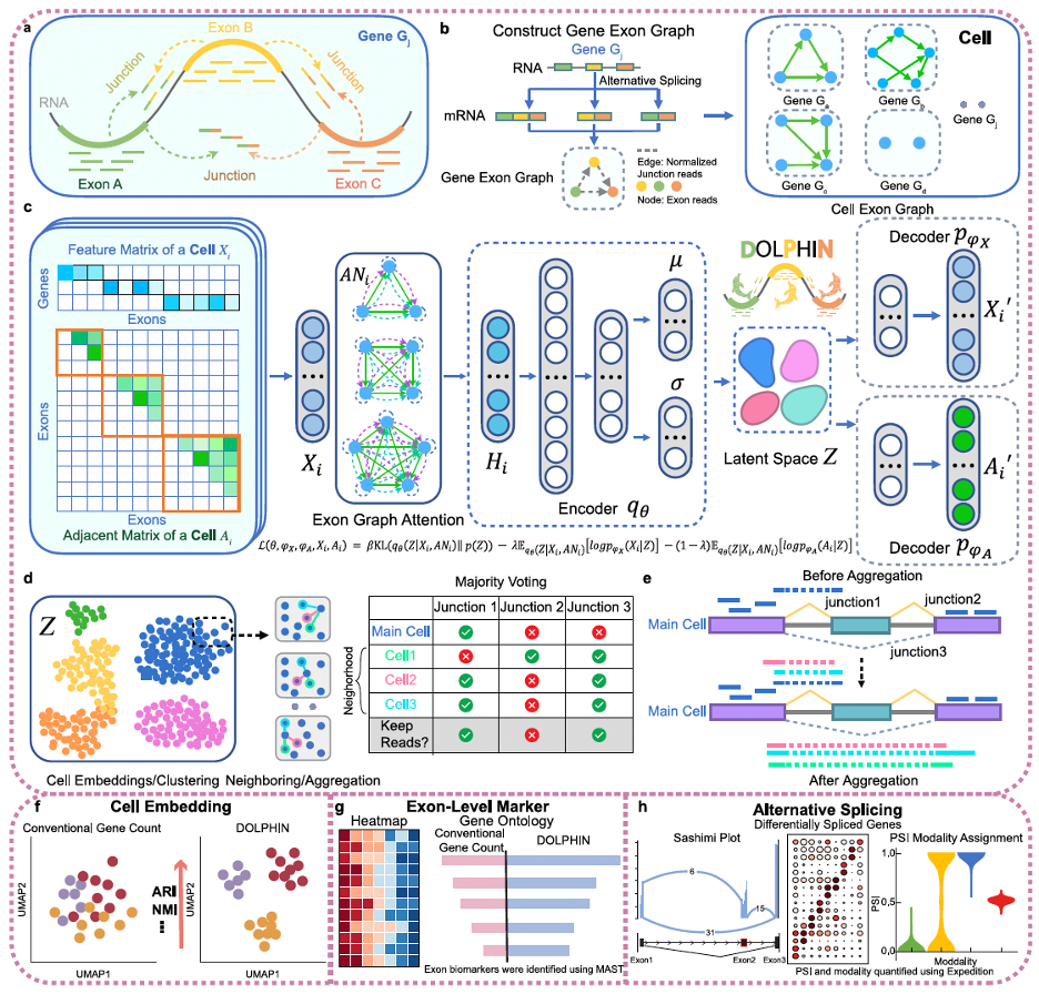 Most single-cell RNA-seq analyses treat each gene as a single count, capturing only the tip of the iceberg and missing the wealth of information hidden beneath the surface. This narrow view overlooks the fine-grained patterns that define a cell’s true identity. In contrast, DOLPHIN works at higher resolution by modeling how transcripts are assembled in each cell and capturing the subtle connections between exons, drawing on information from both exon reads and junction reads. By integrating these patterns with splicing signals, DOLPHIN creates richer cellular profiles that reveal differences others often miss, from fine splicing variations to hidden biological signatures. These enhanced profiles improve downstream tasks such as cell clustering and biomarker discovery and remain robust even for sparse datasets such as 10X Genomics. The study shows how DOLPHIN uncovers biological signals with clear potential for clinical impact.