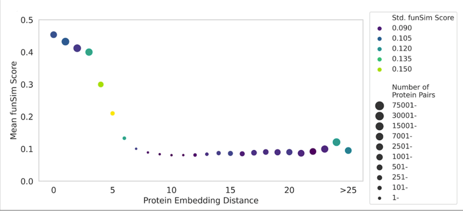 Figure 3. Correlation between the distance of protein embeddings and functional similarity.