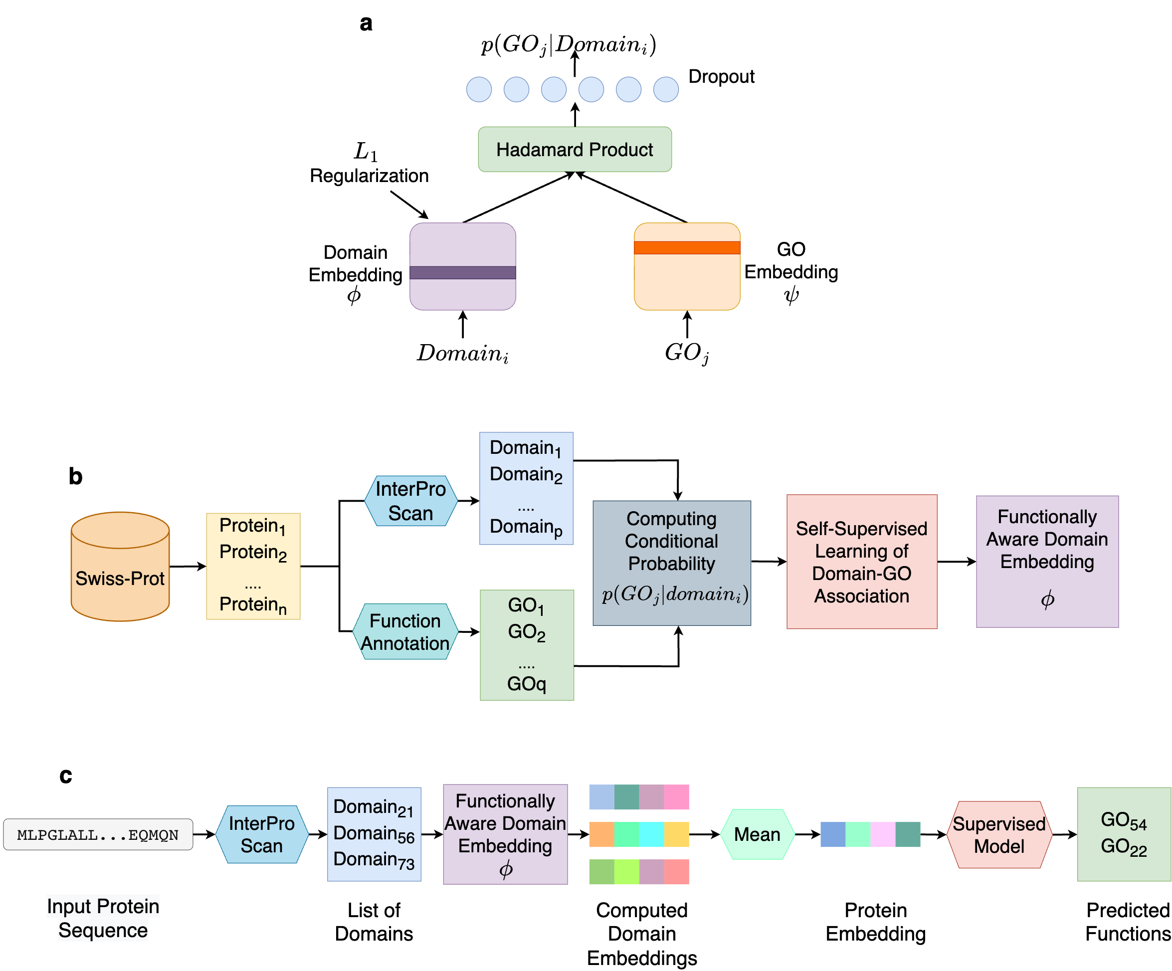 Figure 2. Overview of Domain-PFP. a, the network architecture used for self-supervised learning of domain embeddings. b, the overall pipeline of learning the functionally aware domain embeddings. c, the steps of computing the embeddings of a protein and inferring the functions.