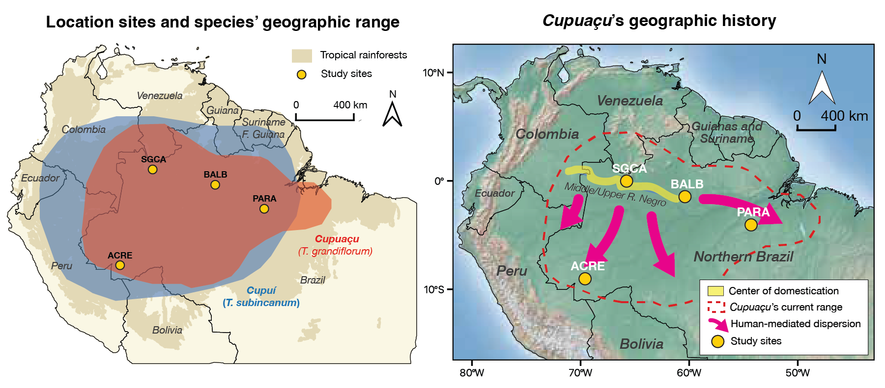 When we depicted the demographic history of cupuaçu and cupuí by analyzing changes in genomic structure of its populations from four sites in Brazil, we found that the domestication process of cupuaçu is marked by two moments: the first occurring 5,000-8,000 years ago, somewhere in Northwestern Amazonia, in the region of the Middle-Upper Rio Negro basin. Conversely, the second important moment of cupuaçu's domestication took place more recently, over the last two centuries, coinciding with historical events in the Brazilian Amazon, including the rubber boom that took place in the late 19th century and large-scale migrations in the 20th century that happened in Brazil's modern history.