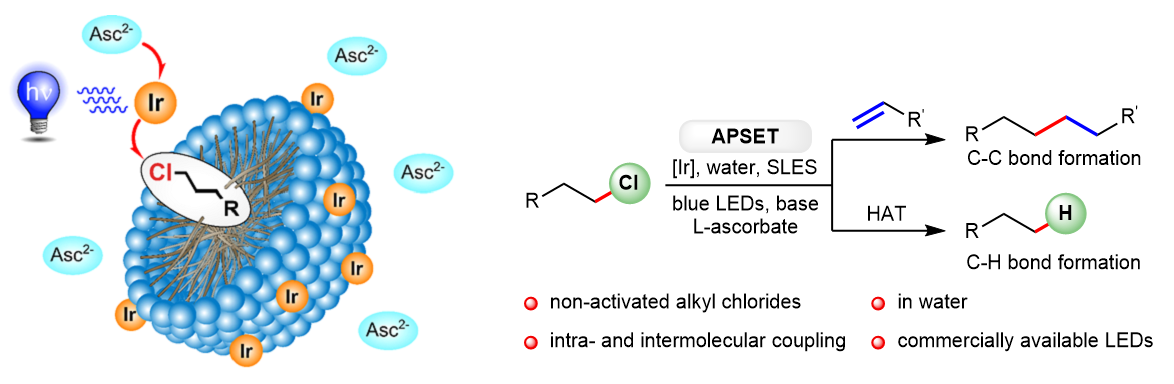 And this was the kind of challenge we were searching for! We first imagined and then designed the assembly-promoted single electron-transfer (APSET) strategy, in which the reacting species are compartmentalized in a microheterogenous, aqueous solution. By using micelles as reaction environment not only solubilisation of the alkyl chlorides should be provided, but also a favourable pre-aggregation in space with the hydrophilic chlorine atoms pointing towards the surface of the micelle. Such close proximity to the photocatalytic Ir-complex should facilitate the single electron-transfer (SET) to the substrates and thereby the generation of radical anions. In order to achieve the required assembly of hydrophobic reaction components and tune the activity of the photocatalytic system, we investigated and optimized the structured solutions. This improved the stability of the reduced Ir-photocatalyst and allowed for engaging non-activated alkyl chlorides in radical dehalogenation, addition as well as cyclization reactions.