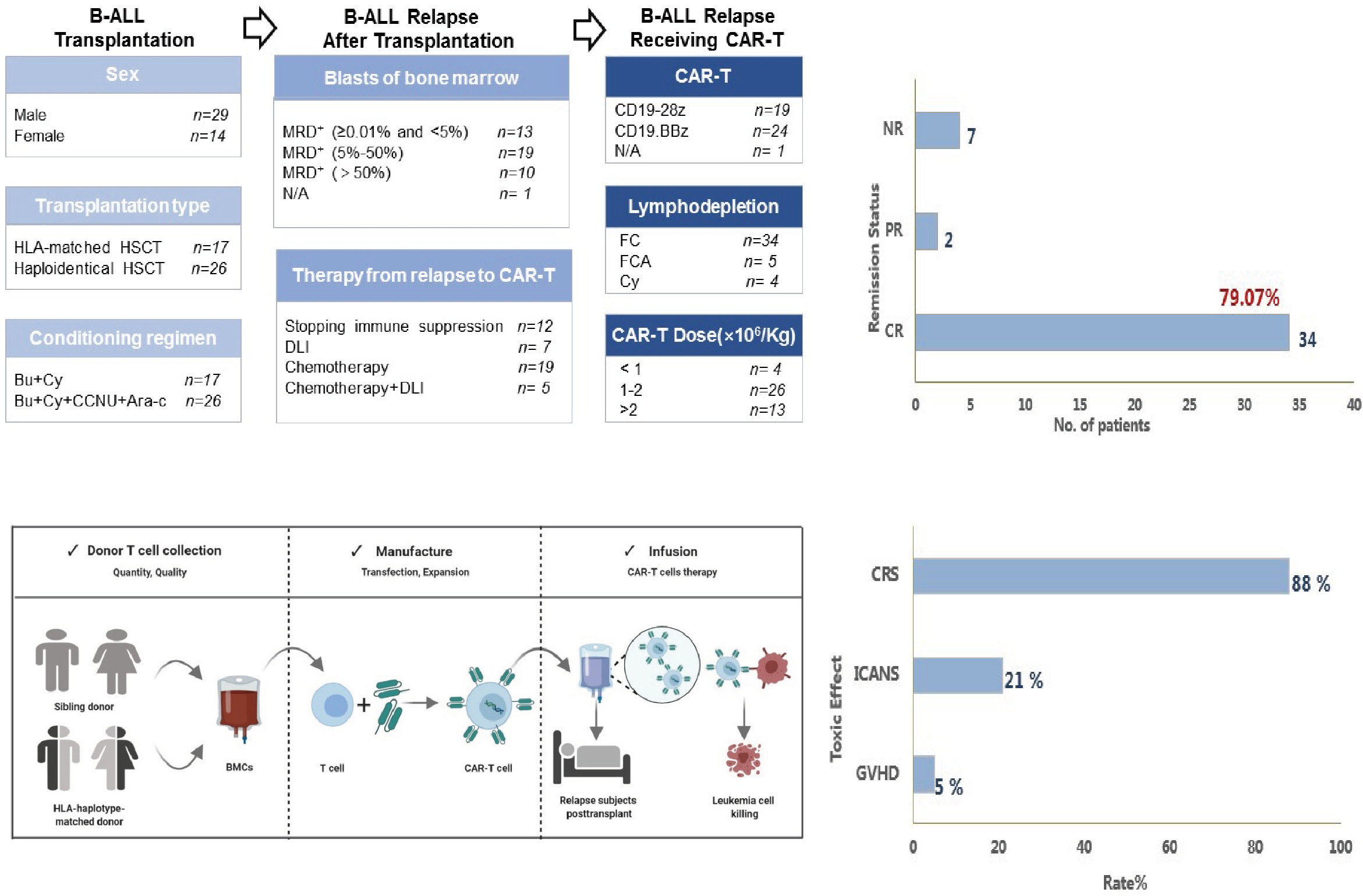 Inspired by this, we designed a retrospective clinical trial which aggregated clinical data from totally nine medical centers in China, making it the largest reported case number of recurrent B-ALL (43 subjects), median follow-up of survivors was 18 months (range, 6-47 months). The outcomes are optimistic, 34 subjects (79%; 95% confidence Interval [CI], 66, 92%) achieved a complete remission. CRS occurred in 38 (88% [78, 98%]) and was ≥ grade-3 in 7. Two subjects died from multi-organ failure and CRS. Nine subjects (21% [8, 34%]) developed ≤ grade-2 ICANS with no cases > grade-2. Two subjects developed ≤ grade-2 acute GvHD. 1-year EFS and survival was 43% (25, 62%). In subjects with a complete remission 1-year probability of CIR was 41% (25, 62%; N =43) and 1-year EFS and survival was 59% (37, 81%; N =43).