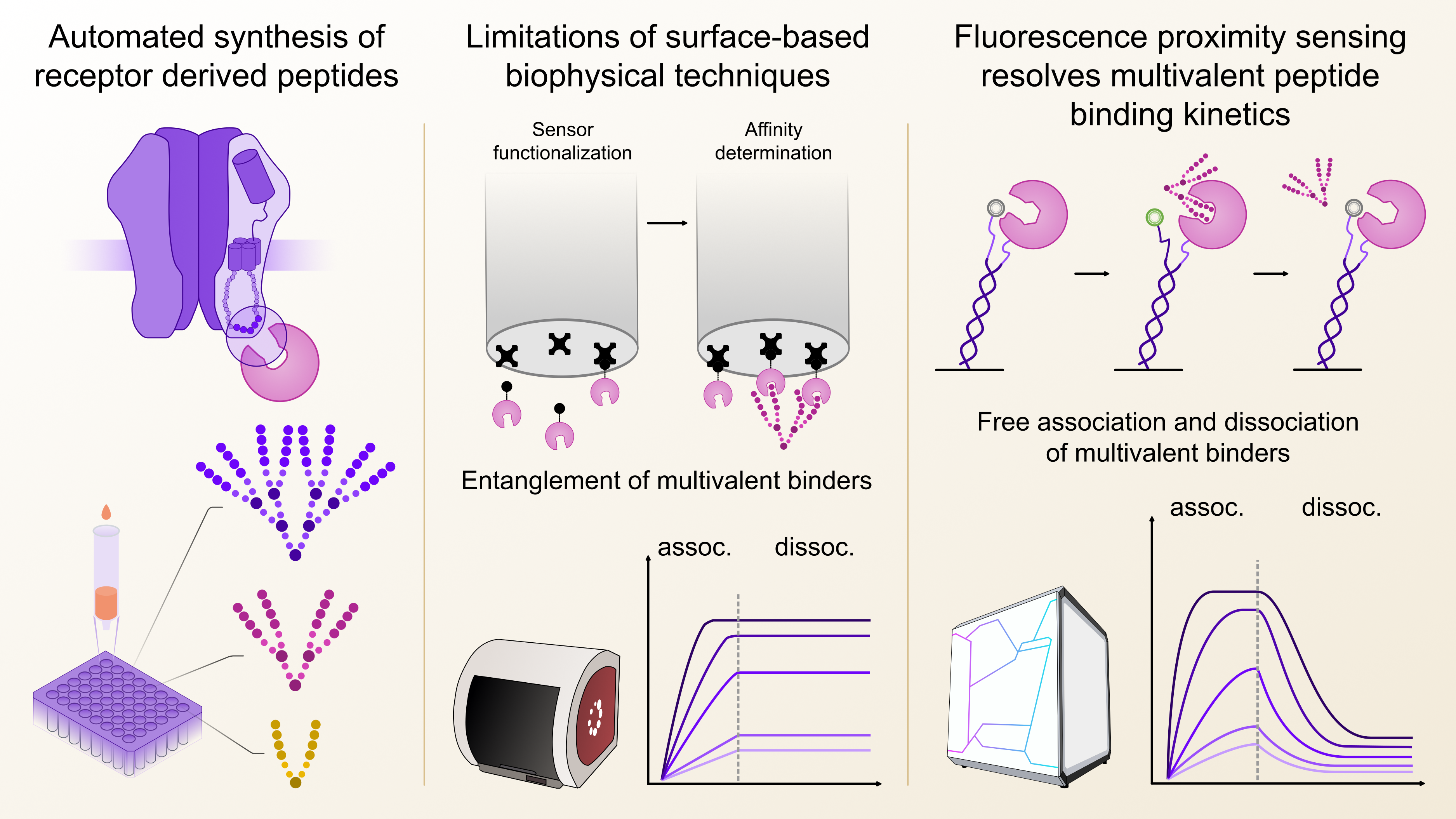 Figure 1: Fluorescence proximity sensing overcomes the limitations of surface-based kinetic biophysical techniques. Kinetic profiling of multivalent peptides from small scaled automated synthesis with biolayer interferometry was hindered by irreversible entanglement of the multivalent binders on the sensor surface. Especially the off-rate or dissociation (dissoc.) could not be determined. In fluorsecence proximity sensing, this limitation was overcome by immobilizing the target protein at a defined distance.