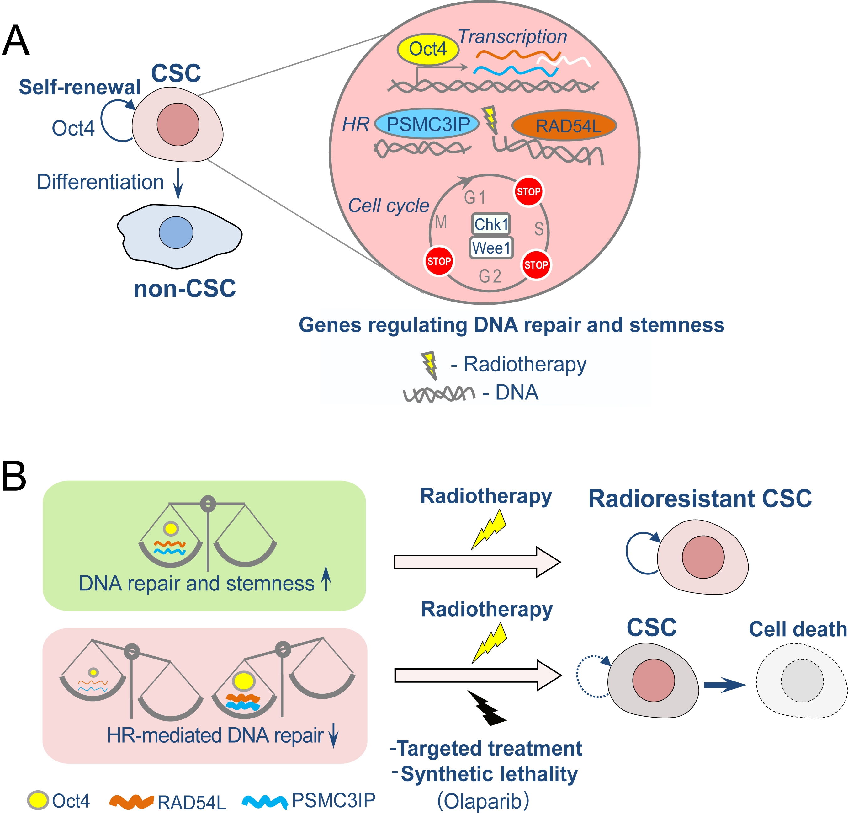 Figure 1. (A) Oct4 contributes to the HNSCC radioresistance by modulating expression of genes regulating DNA repair and CSC properties. (B) Oct4-dependent regulation of tumor radioresistance depends on its precise intracellular level, and both high expression and loss of Oct4 are associated with abnormal homologous recombination-mediated DNA repair. Combination of radiotherapy with DNA repair inhibitors such as PARP-inhibitors or other targeted treatments may cause synthetic lethality in Oct4-deregulated tumors including cancer stem cell eradication. CSC: cancer stem cells, HR: homologous recombination.