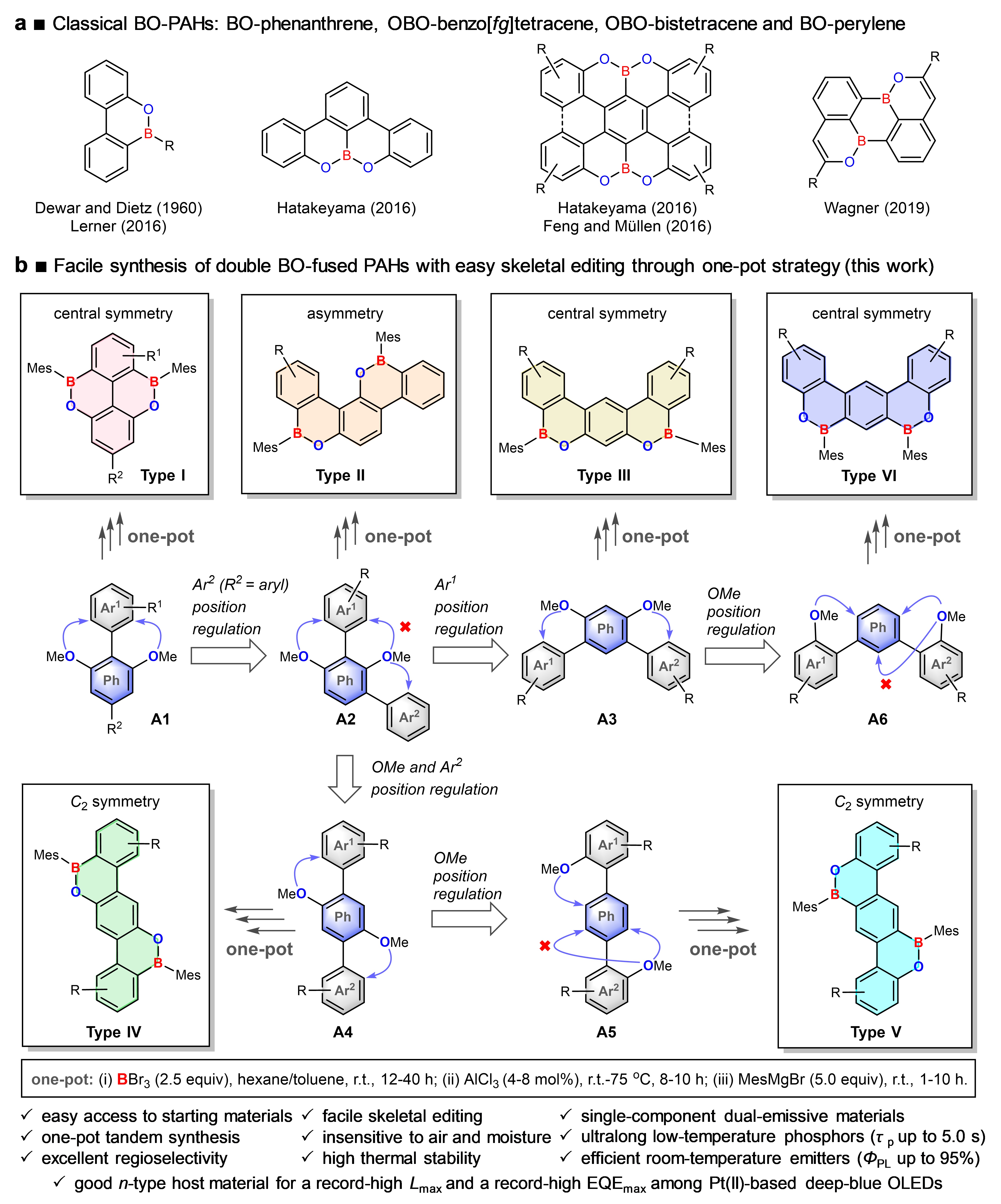 Their molecular configurations, as well as photophysical and excited-state properties, are systematically studied by X-ray crystallography, theoretical calculations, optical spectroscopy, and device physics. The doubly embedded B–O units can efficiently regulate the photophysical and excited-state properties, enabling the dBO-PAHs to act as robust emitters, ultralong afterglow materials, or n-type host materials for high-brightness and high-efficiency deep-blue OLEDs.