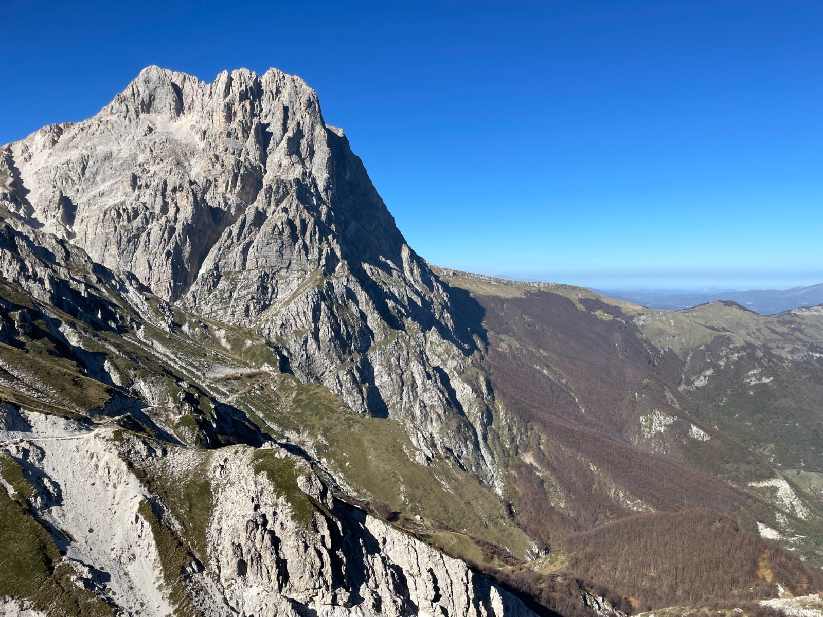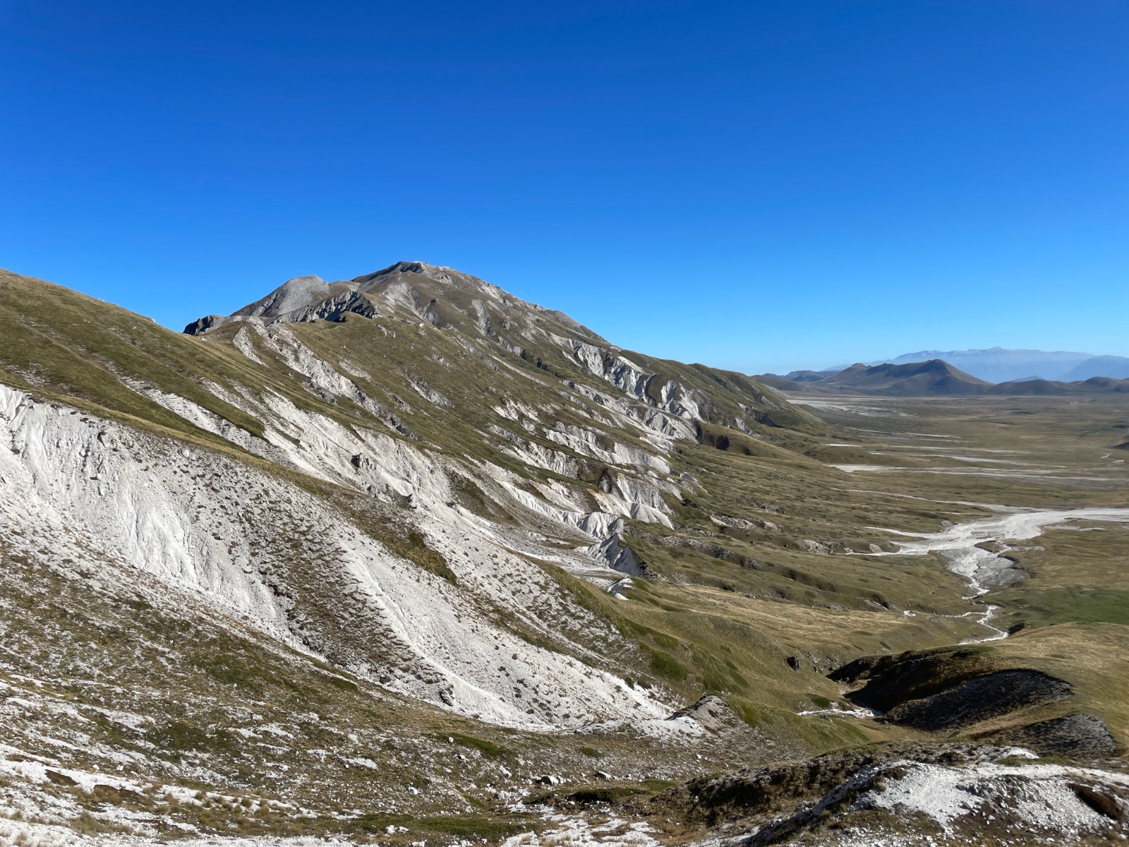 Panoramic view of the Campo Imperatore intramountain basin, Gran Sasso Range, Central Apennines, Italy. The along strike white damage zone of the normal/transtensional Tre-Selle and Vado di Corno faults is clearly visible in the left of the image, with mostly Mesozoic limestones and dolostones breccias. The width of the cataclastic core is larger than 300 m accommodating about 1-2 km vertical throw. Holocene alluvial deposits cover the plain to the right. North to the left.