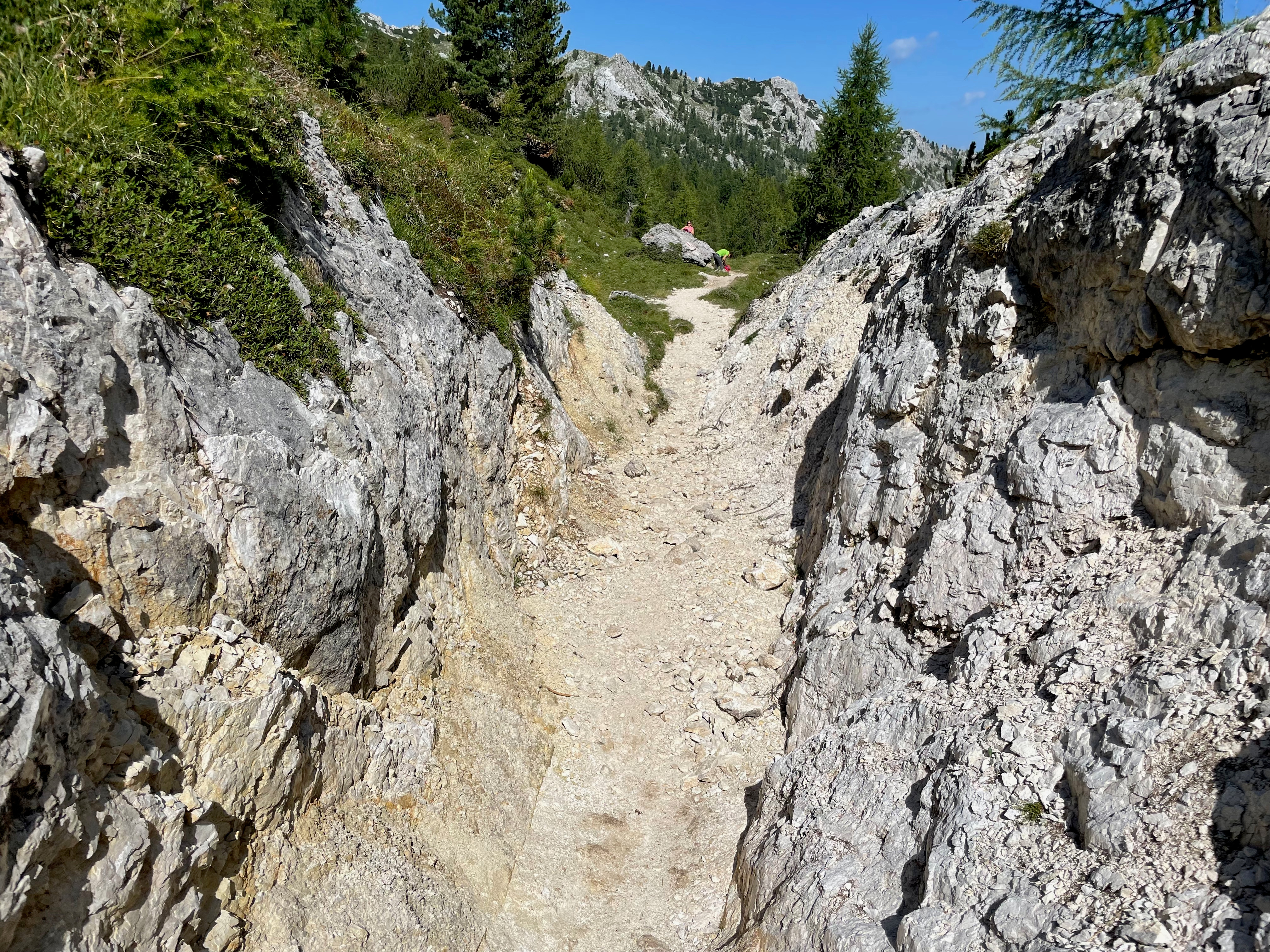 Damage zone of a left-lateral N-S-trending strike-slip fault. The cataclastic core affects upper Triassic dolomites (SettSass massif, Dolomites, northern Italy) in both wall sides. Note the width of the fault zone that is about 2 m and the horizontal displacement is only 50 m apart, i.e., quite a large damage zone in spite of a small offset.
