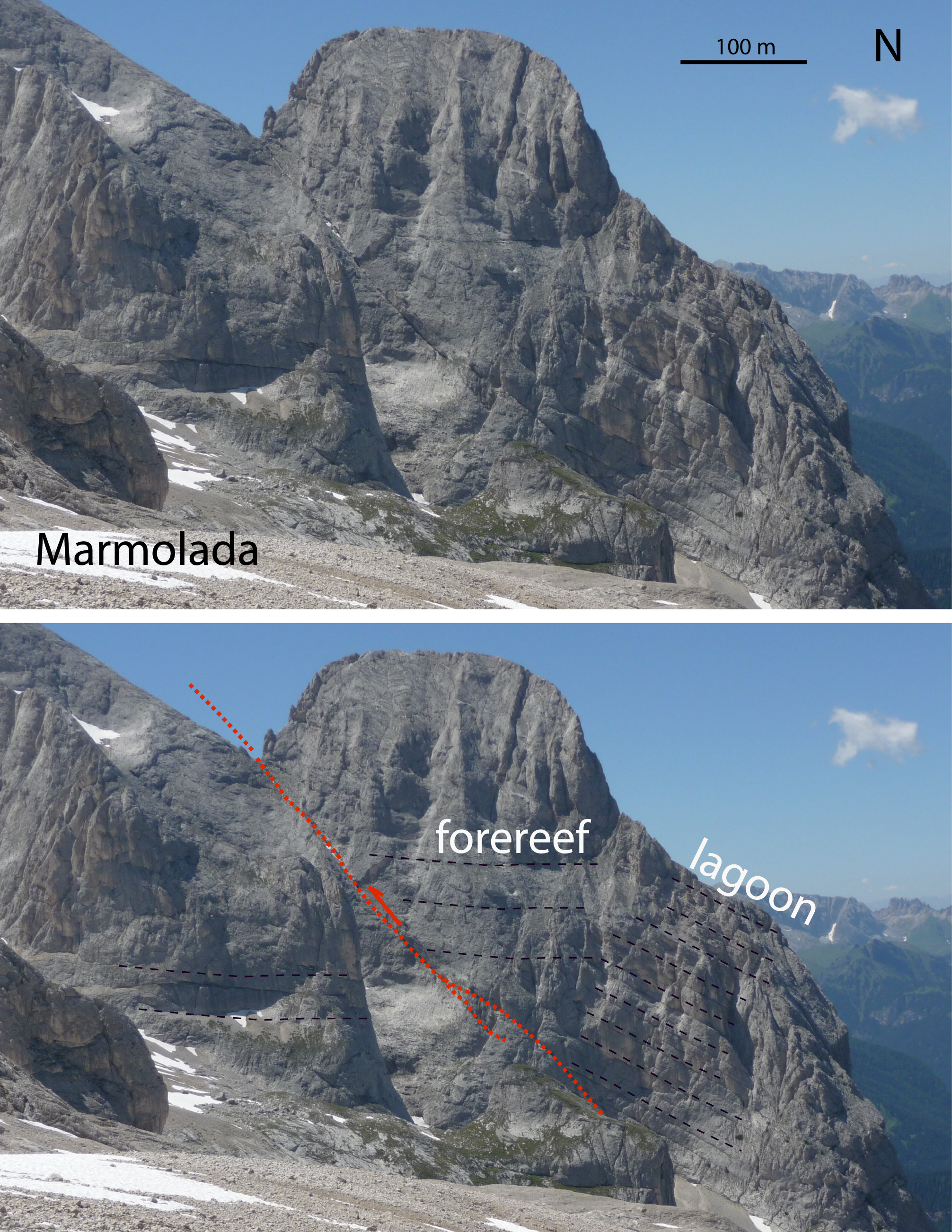 Alpine S-verging thrust in Middle Triassic carbonate platform, Marmolada Massif in the Dolomites. Note there is a sharp, thin and concentrated damage zone.