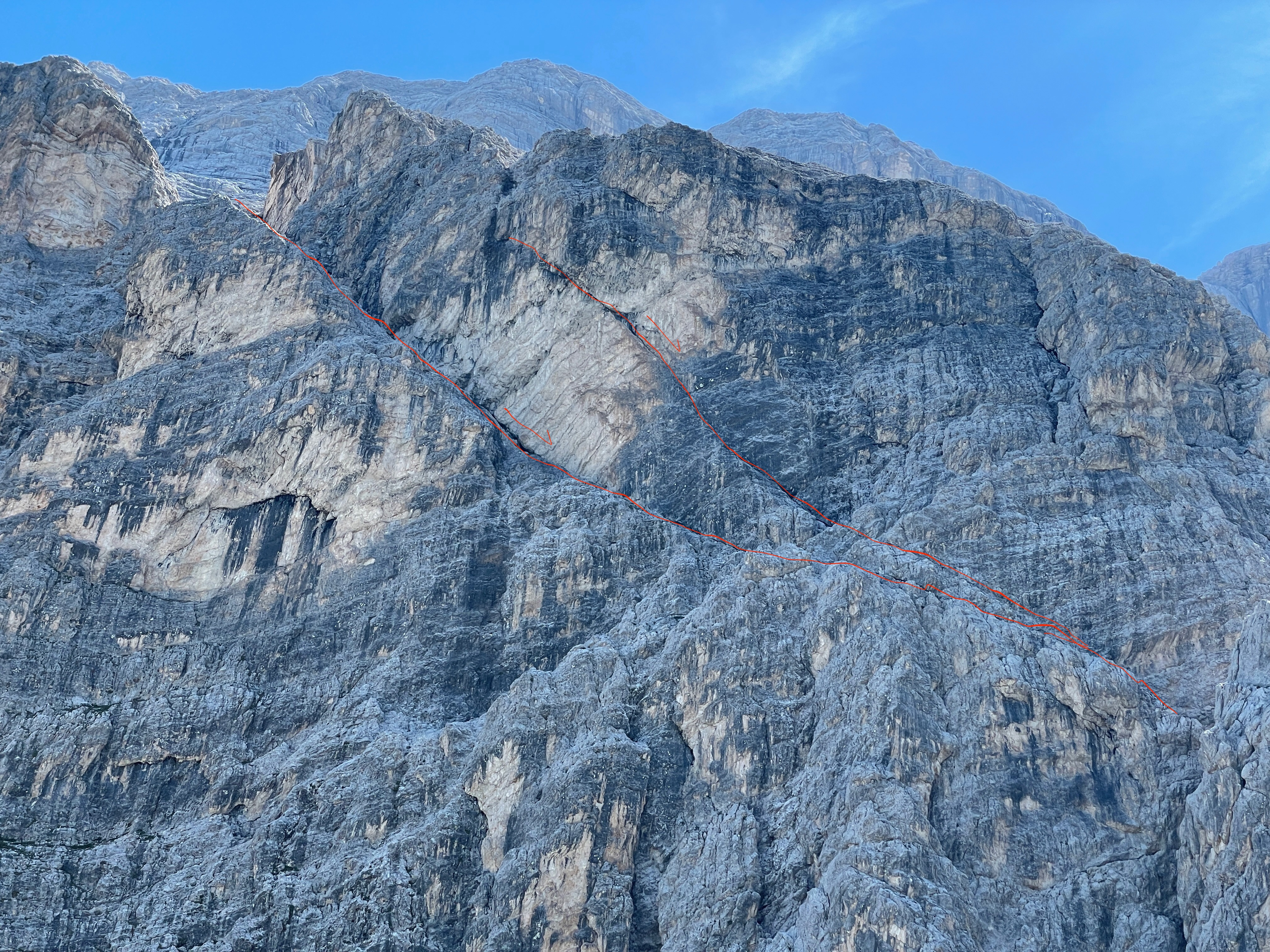 Branching of two Mesozoic normal faults in the tidal Norian Dolomia Principale of the Conturines Massif in the Dolomites, northern Italy. The offset is only few tens of meters, but the deformation is spread into different segments of a large hanging-wall volume.