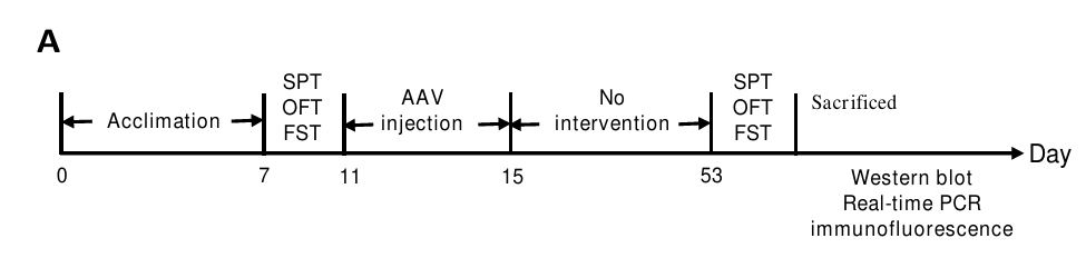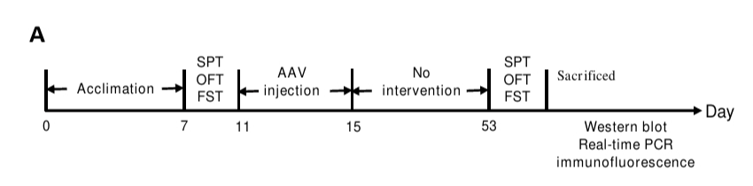 Experiment 3: A third rat group was randomly into CUMS+AAV-control and CUMS+Down-MKP-1 groups (N = 10). Rats were subjected to CUMS for 42 days as detailed following injection of the AAV virus (Figure 3A). Six weeks after the final CUMS exposure, depressive-like behaviors and gene or protein expression changes were assessed using the same methods as in Experiment 1.