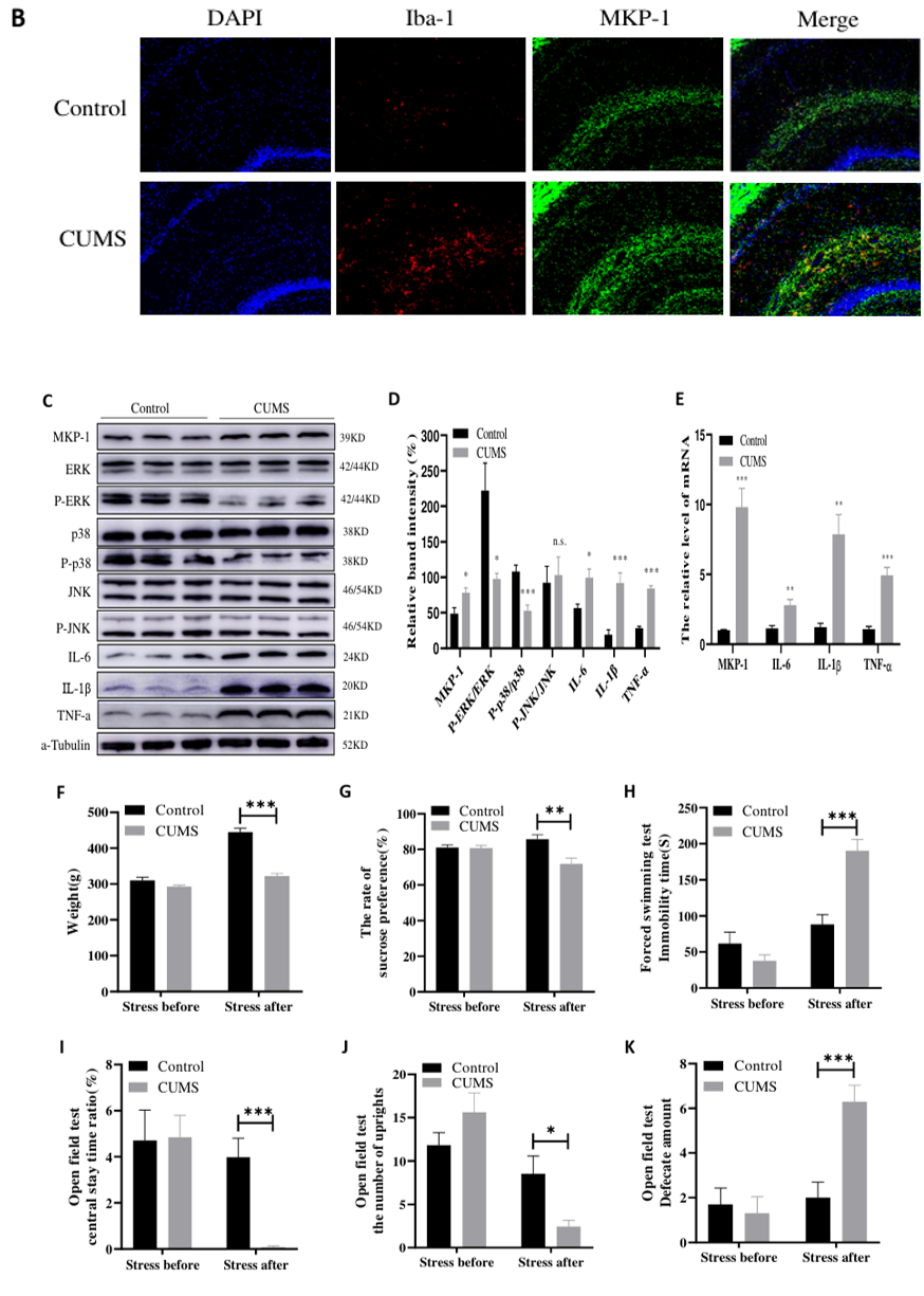 - Chronic unpredictable mild stress (CUMS) upregulates MKP-1 and pro-inflammatory cytokines in the hippocampus, increases hippocampal microglial number, and promotes depression-like behaviors in rats.