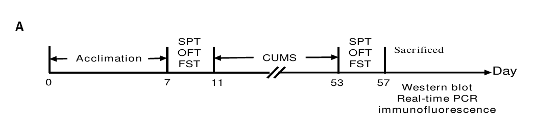 In Experiment 1, naïve SD rats were randomly assigned to a control group (N = 10) and a chronic unpredictable stress group (N =10). Rats in the chronic unpredictable stress (CUMS) group were subjected to various daily stressors for 42 days while control rats received daily handling (Figure 1A). Depressive-like behaviors were measured using the open field test (OFT), forced swimming test (FST), and sucrose preference test (SPT) before and after CUMS or control handling. Rats were sacrificed 24 h after the last behavioral test. The hippocampal expression levels of MKP-1, MAPK isoforms extracellular regulated kinase (ERK), phosphorylated (p)-ERK, c-Jun N-terminal kinase (JNK), p-JNK, p38 MAPK, p-p38 MAPK, [IL]-1β,[IL]-6, and [TNF]-α were estimated by western blotting and real-time PCR while coexpression of MKP-1 with the microglial marker IBA-1 was examined in brain slices by immunofluorescence staining.