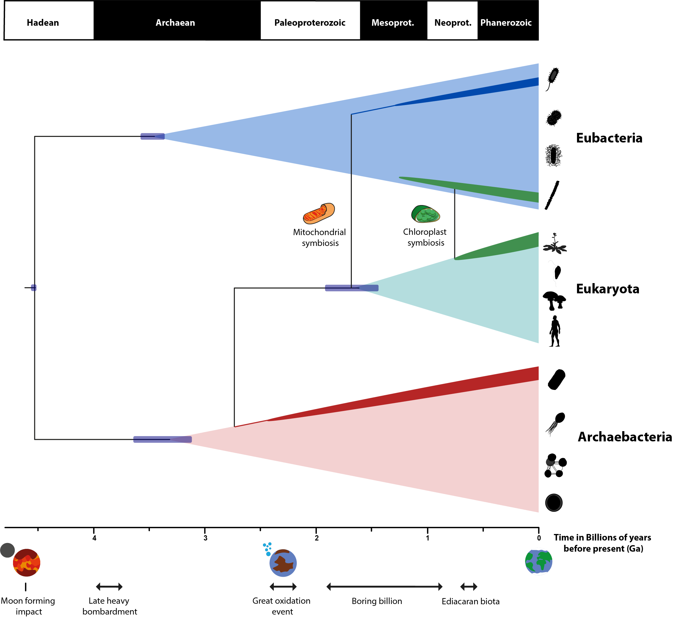 Our results include the output from analyses performed with a variety of different parameters and show that the last universal common ancestor (LUCA) of life existed prior to an event known as the late heavy bombardment (>3.9 billion years ago). Crown group Eubacteria and Archaebacteria then appear almost one billion years later in the Palaeoarchaean. Our timescale lines up with those that have been previously published for the eukaryotes and has some interesting results regarding the origination of two bacterial lineages that are important for understanding the evolution of complex eukaryotic cells. Crown Cyanobacteria radiate after the Great Oxidation Event (GOE), suggesting that photosynthesis evolved along the stem-cyanobacterial lineage, and total-group alphaproteobacterial, to which the free-living ancestor of the mitochondrion belonged have an overlapping credibility interval with the evolution of crown eukaryotes, suggesting a fast radiation of the eukaryotic lineages in the wake of the mitochondrial symbiosis. The hope is that this project will act as a starting point for other research using integrative methods to think about the very earliest lineages of life.