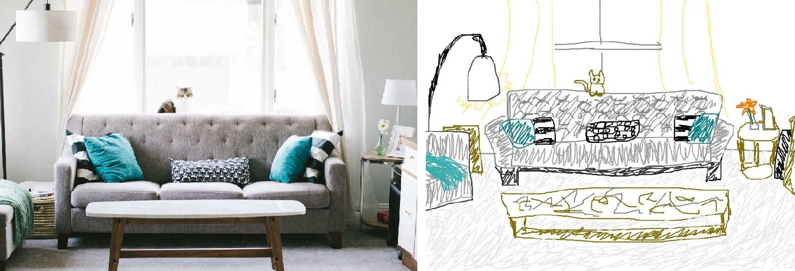 You can see there’s a fair amount of accurate detail here that is hard to describe verbally – objects, colors, shapes, sizes, and objects in their correct places. There are some interesting errors here as well – a mix-up of the flower’s color, a misordering of the pillows on the couch. You can also see shortcuts in the drawing, like my very rough attempt at giving texture to the coffee table. It’s clear that this drawing reveals a lot about what’s in the memory, but it’s hard to measure through objective means. The critical challenge we faced was how to evaluate these sketches objectively.