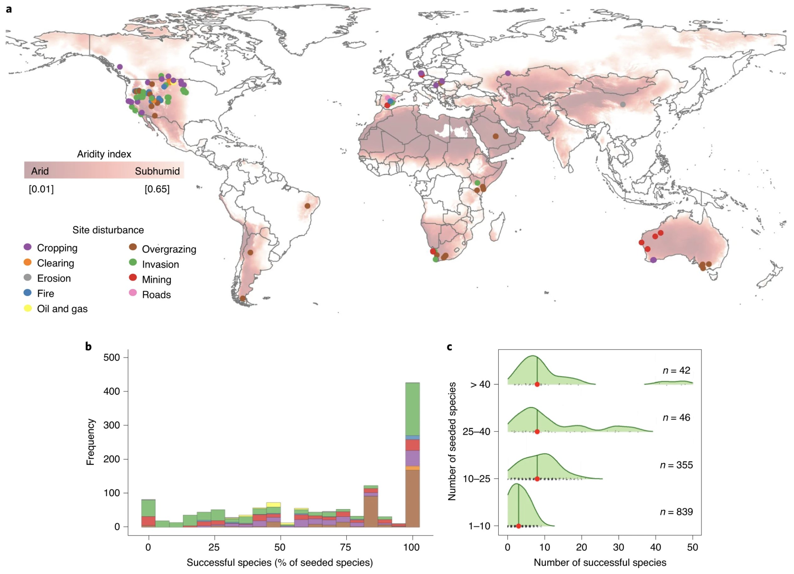 The persistent degradation of ecosystems around the world has created an unprecedented need for restoring biodiversity and ecosystem function. However, the science of restoring ecosystems is still in its infancy, and restoration practice often results in widely variable and unpredictable outcomes. As a scientific and applied field, we are still building our understanding of the processes that cause spatiotemporal variation in restoration success and failure. An example is seed-based restoration in drylands, where the increasingly harsh and variable climate means that an individual seed faces multiple barriers to successfully germinating, emerging, and persisting. Despite this, seeding is one of the common techniques in dryland restoration; though there are many success stories to drive its continued use as a restoration tool. To improve seeding outcomes generally, restoration practitioners must learn collectively from our successes and failures. Thus, a team of us set out to amalgamate datasets on seeding experiments in dryland ecosystems. By 2019, we had collected data from across 174 restoration sites on six continents.